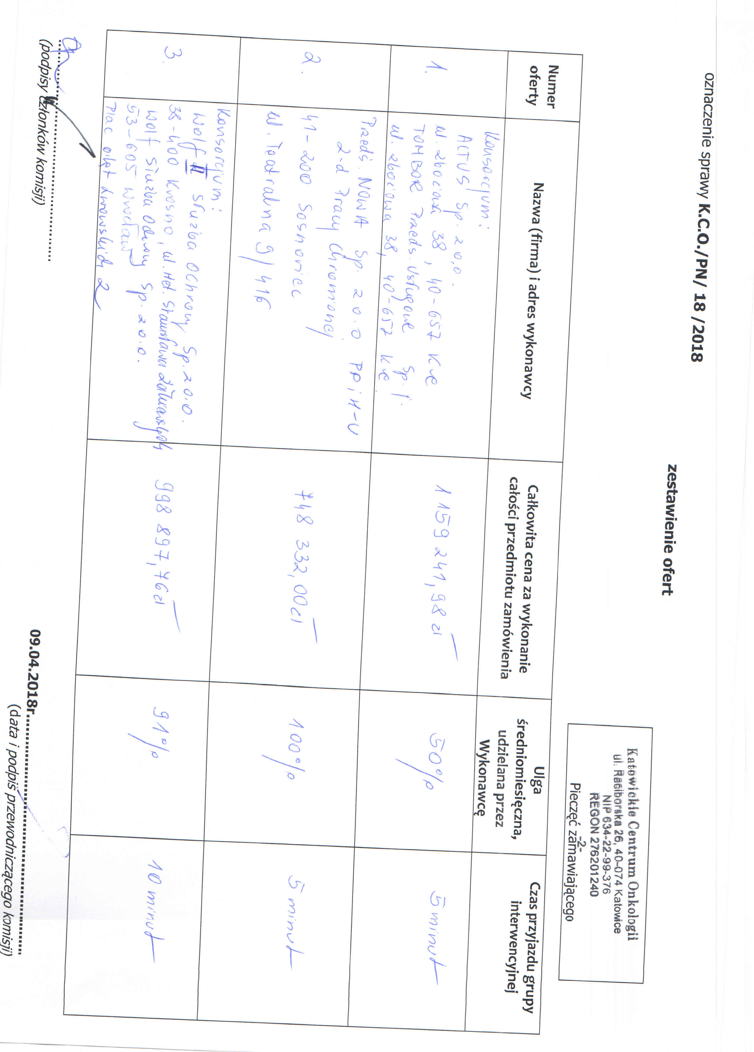 Oferty należy złożyć do dnia 04.04.2018r. do godz. 10:00 w Kancelarii Dyrektora Katowickiego Centrum Onkologii w Katowicach przy ul. Raciborskiej 26, I piętro.