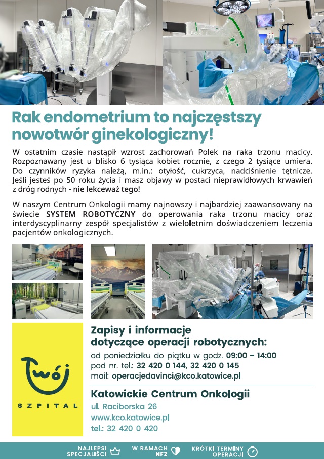 ZAPISY informacje dotyczące operacji robotycznych u Pełnomocnika Dyrektora ds. Koordynacji Operacji Robotycznych mgr Agaty Kisiel od poniedziałku do piątku w godz. 09:00-14:00 pod numerem telefonu 32 42 00 144 e-mail: operacjedavinci@kco.katowice.pl