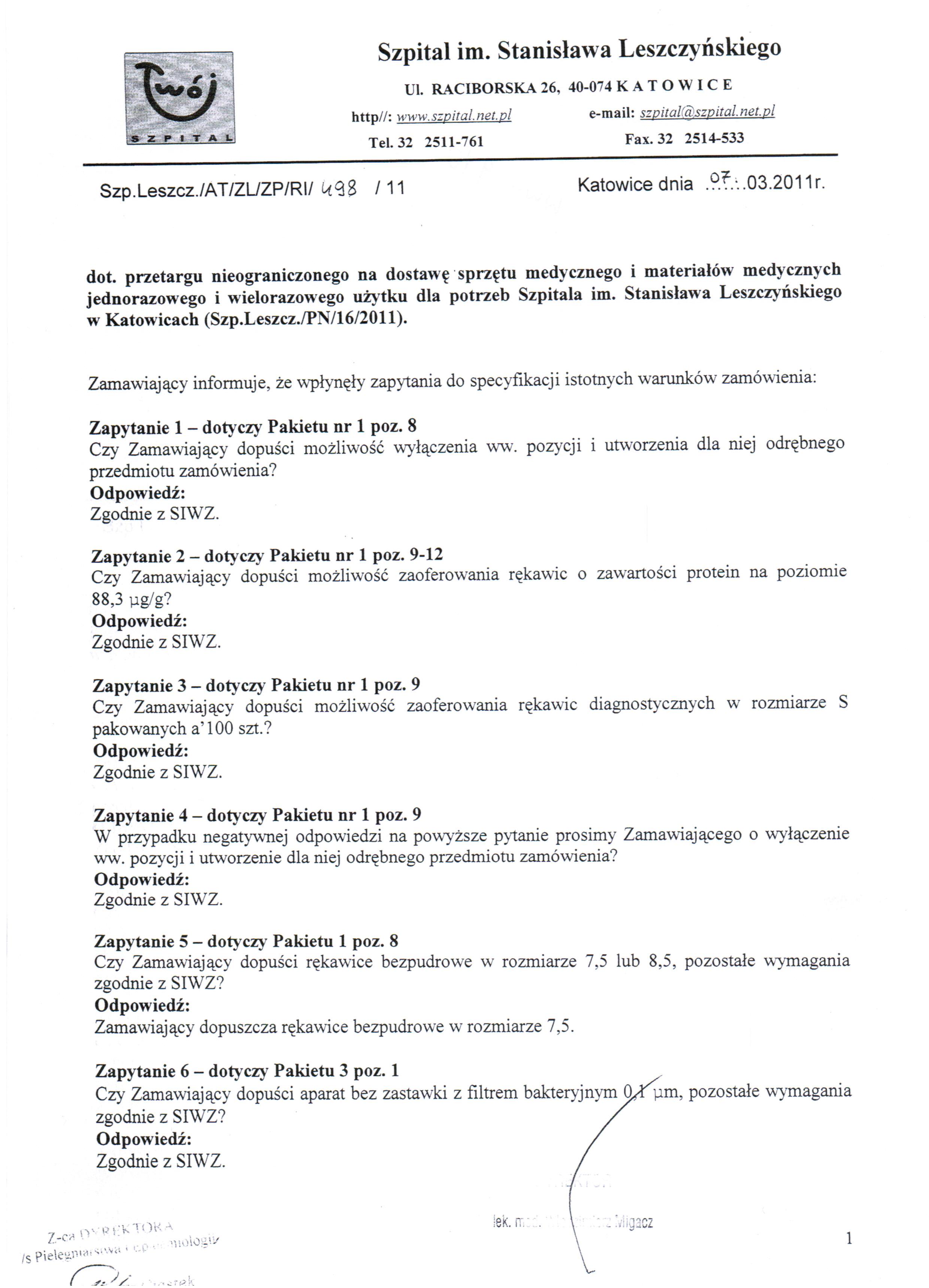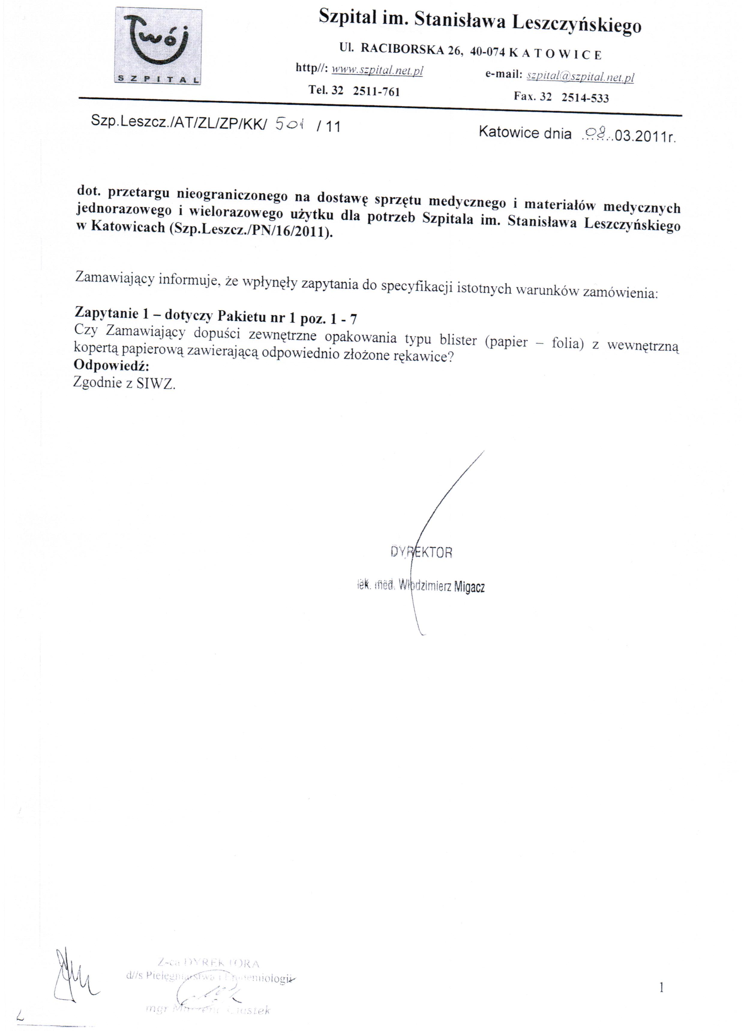 Otwarcie ofert nastąpi w dniu 11.03.2011r. o godz. 11:00 w Budynku Poradni Szpitalnej w Katowicach przy ul. Raciborskiej 28 (II piętro).