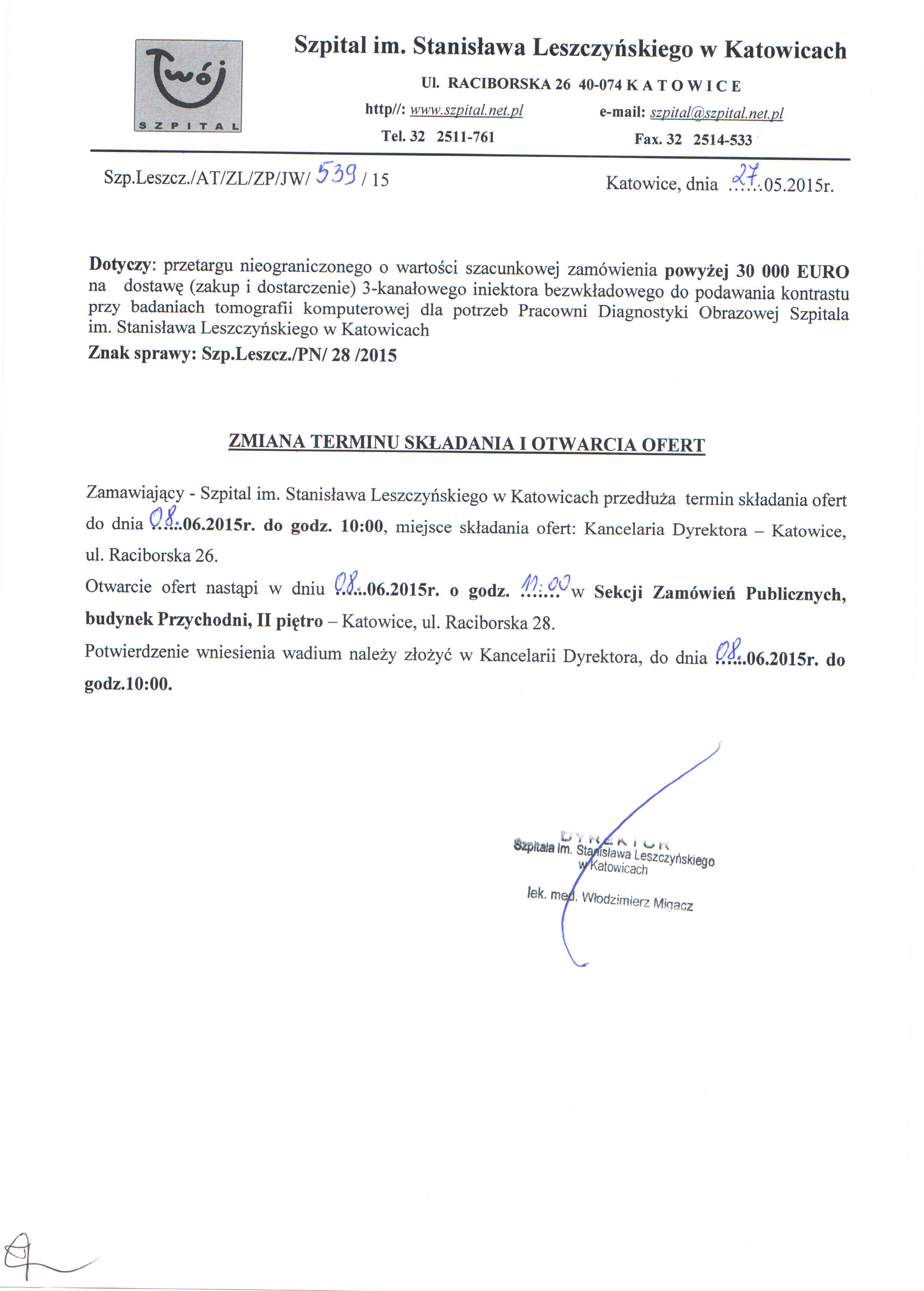 ogłasza przetarg nieograniczony o wartości szacunkowej zamówienia powyżej 30.000 EURO na dostawę (zakup i dostarczenie) 3-kanałowego iniektora bezwkładowego do podawania kontrastu przy badaniach tomografii komputerowej dla potrzeb Pracowni Diagnostyki Obrazowej Szpitala im. Stanisława Leszczyńskiego w Katowicach