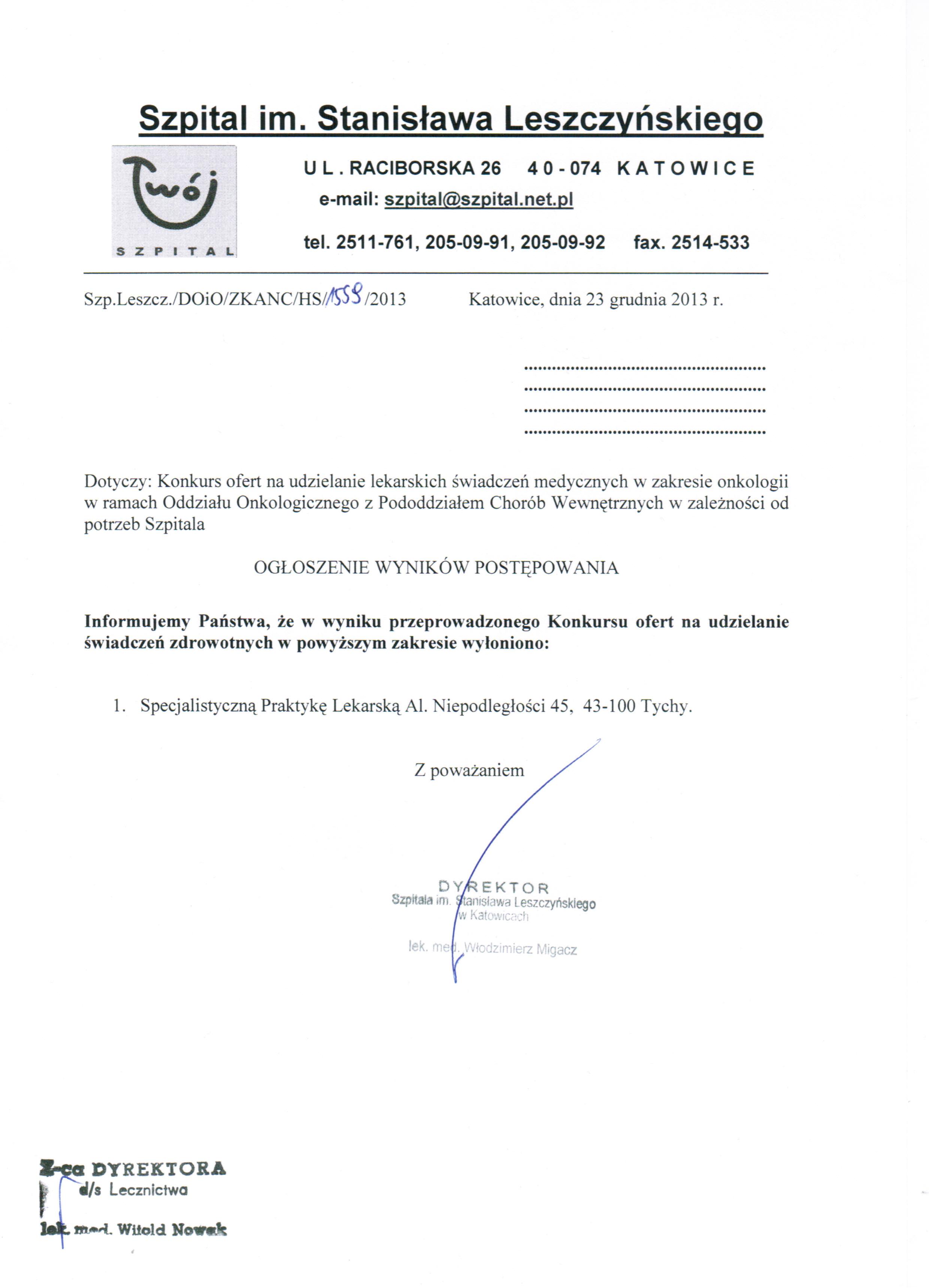 Dodatkowych informacji udziela Z-ca Dyrektora ds. Lecznictwa lek. med. Witold Nowak pod nr tel. (32) 251 17 61.