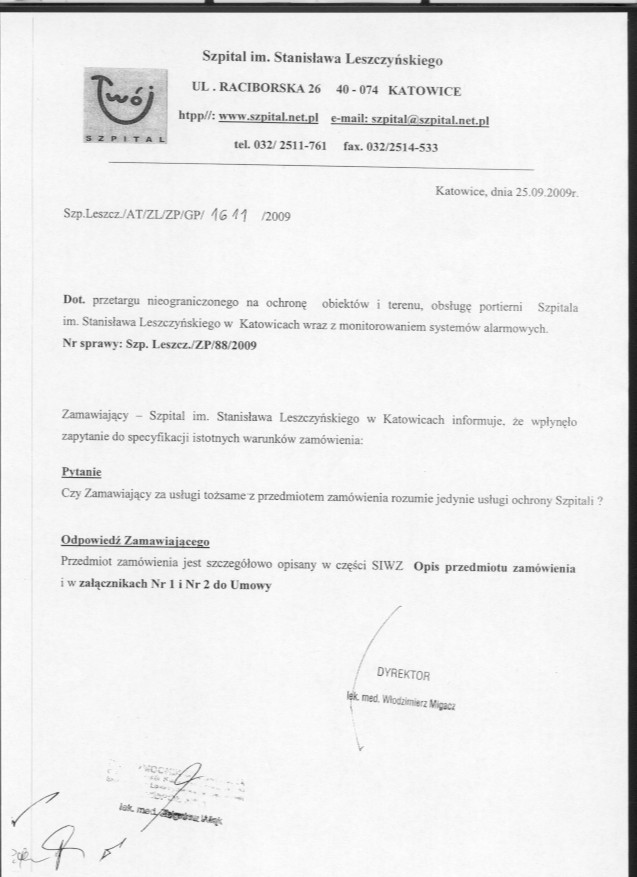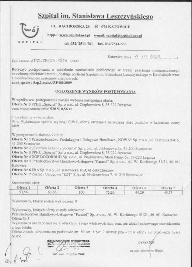 Oferty należy złożyć do dnia 05.10.2009r. do godz. 10.00 w Kancelarii Dyrektora w Katowicach przy ul. Raciborskiej 26.