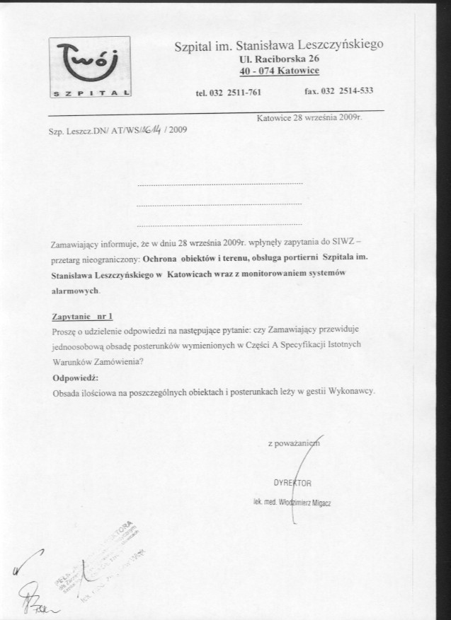 Otwarcie ofert nastąpi w dniu 05.10.2009r. o godz. 11.00 w Sali Konferencyjnej Zakładu Radioterapii w Katowicach przy ul. Raciborskiej 27.