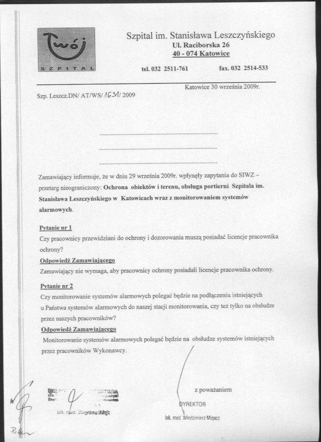 ogłasza przetarg nieograniczony o wartości szacunkowej zamówienia powyżej 14.000 EURO na ochronę obiektów i terenu, obsługę portierni Szpitala im. Stanisława Leszczyńskiego w Katowicach wraz z monitorowaniem systemów alarmowych