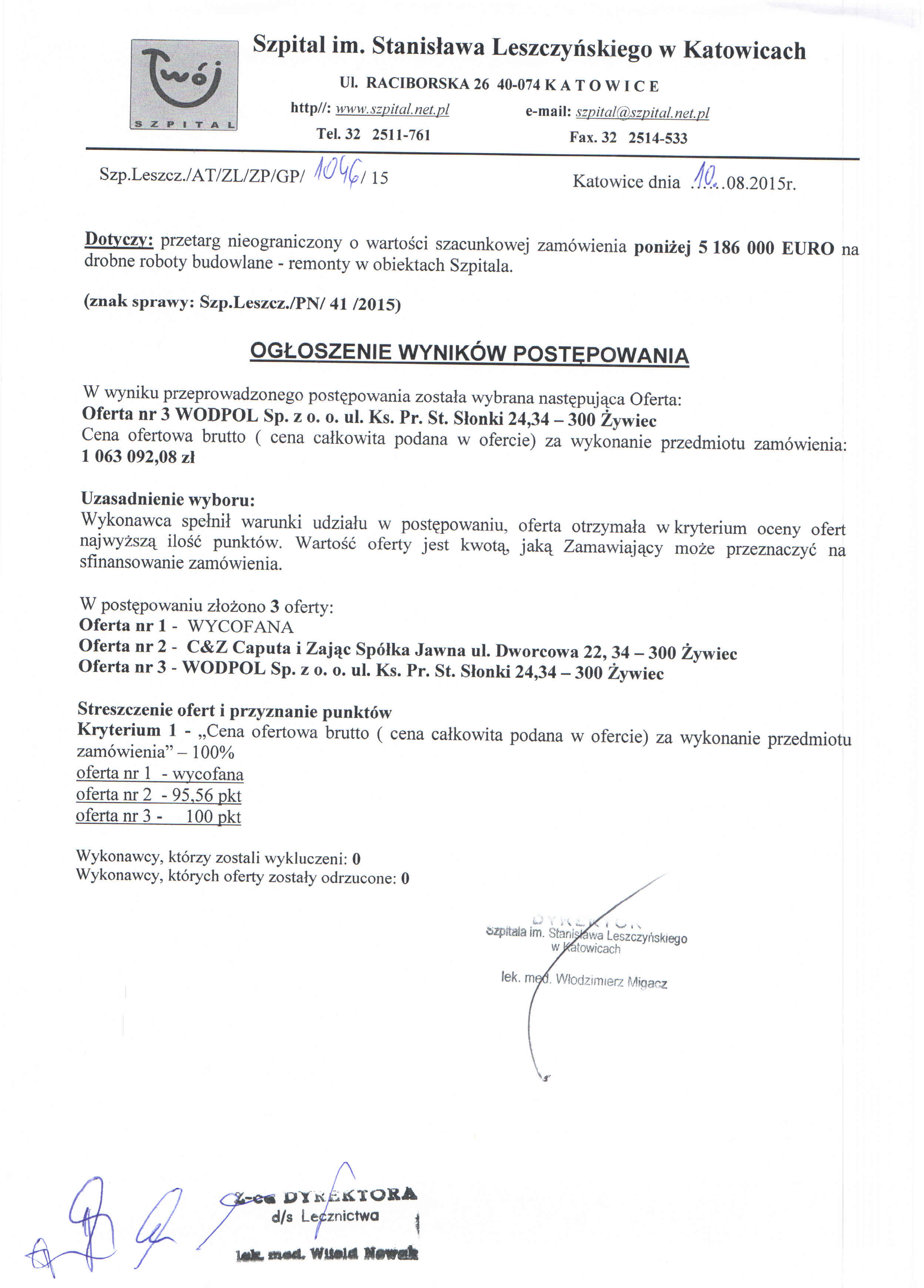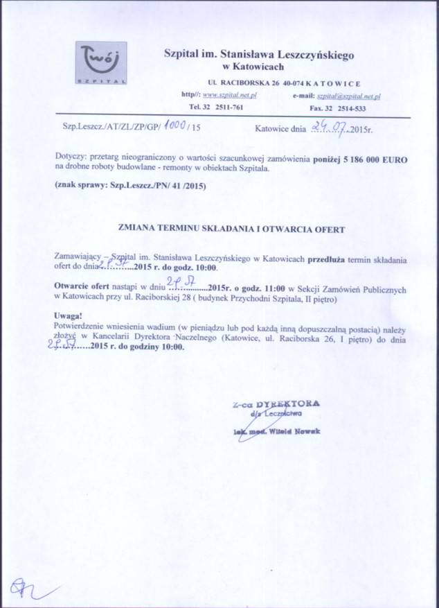 do dnia 21.07.2015r. do godz. 10:00 w Szpitalu im. Stanisława Leszczyńskiego w Katowicach ul. Raciborska 26 – Kancelaria Dyrektora, I piętro.