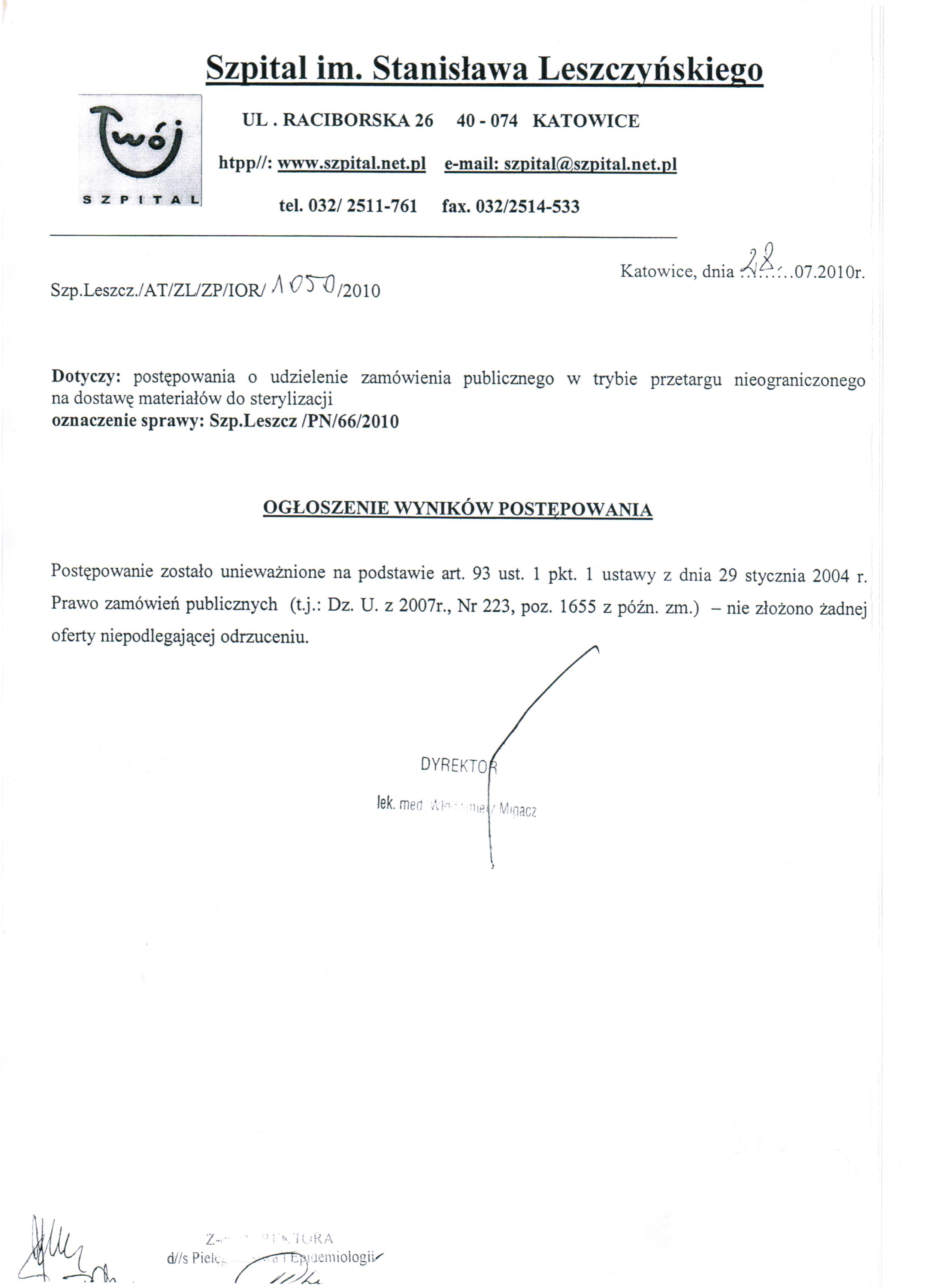 do dnia 27.07.2010r. do godz. 10:00 w Kancelarii Dyrektora Szpitala w Katowicach przy ul. Raciborskiej 26.