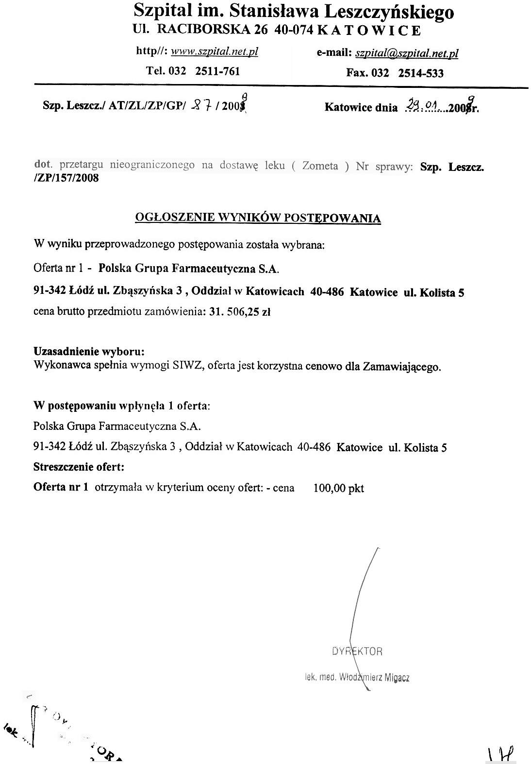 Oferty należy złożyć do dnia 27.01.2009r. do godz. 11.00 w Kancelarii Dyrektora Szpitala w Katowicach, przy ul. Raciborskiej 26.