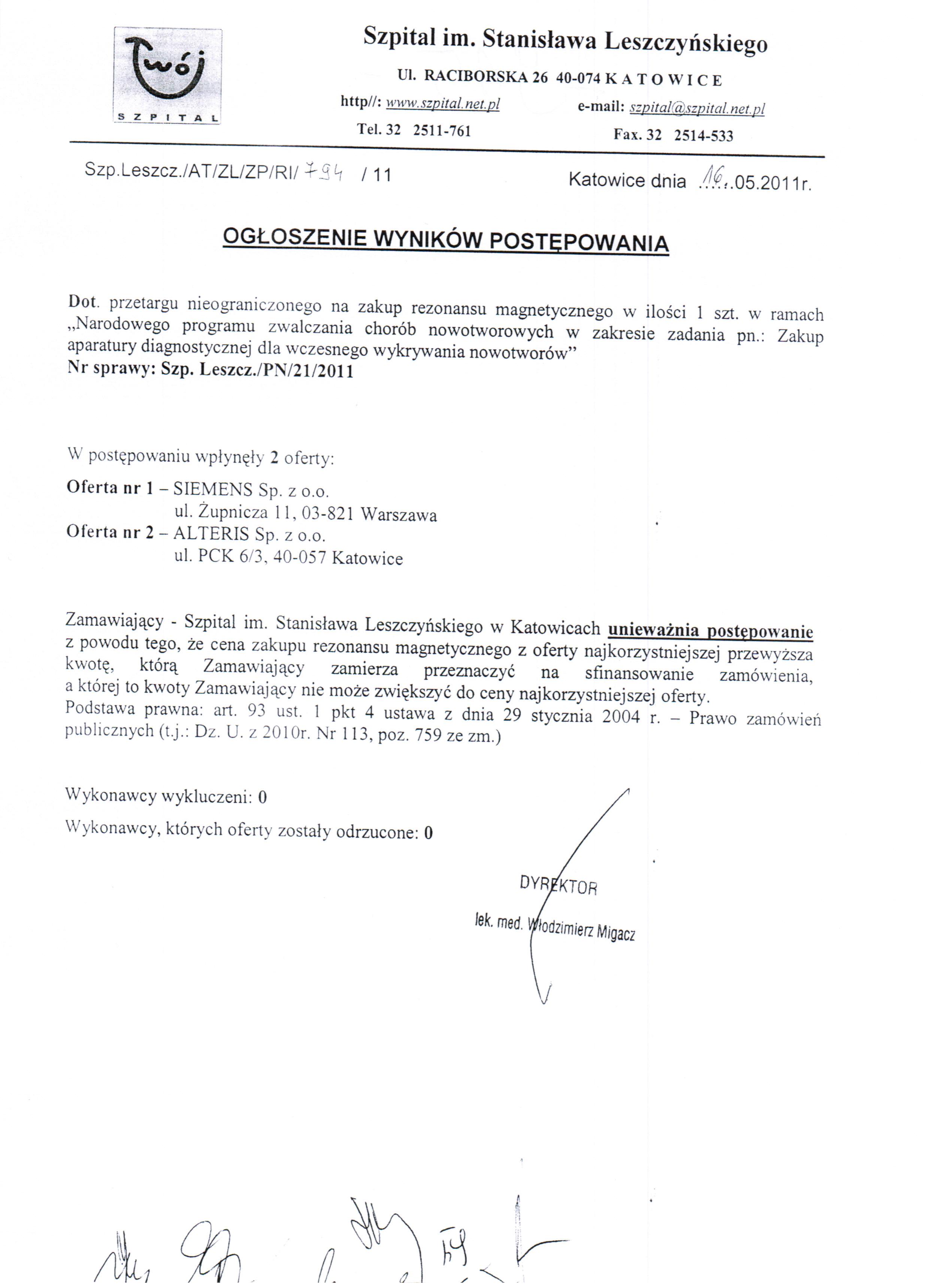 Oferty należy złożyć do dnia 10.05.2011r. do godz. 10:00 w Kancelarii Dyrektora Szpitala