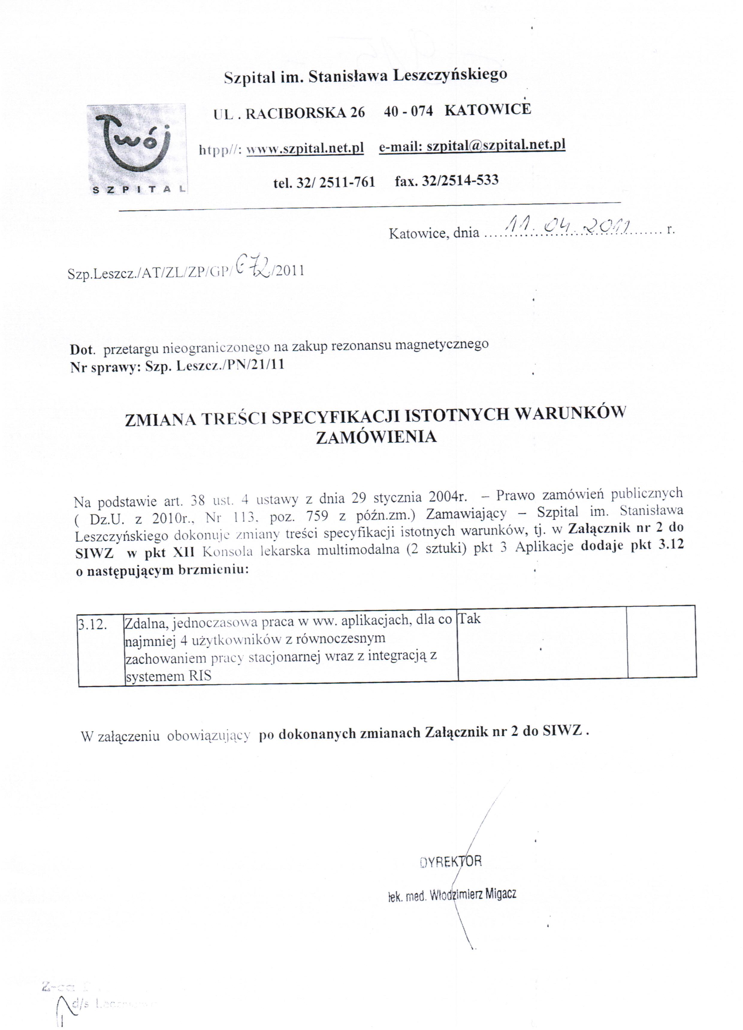 Otwarcie ofert nastąpi w dniu 10.05.2011r. o godz. 11:00 w Sekcji Zamówień Publicznych w Katowicach przy ul. Raciborskiej 28 (budynek Przychodni Szpitala, II piętro).
