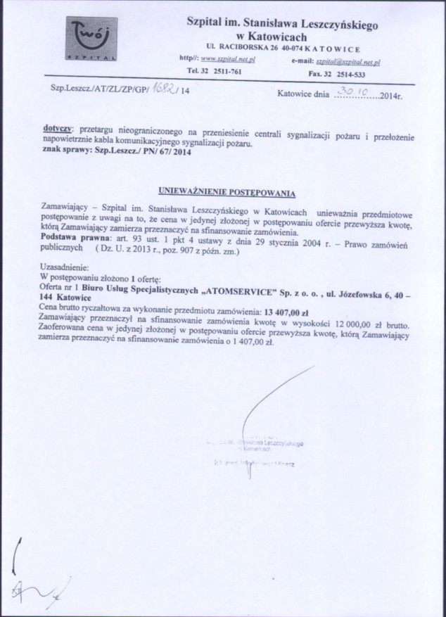 w dniu 06.10.2014r. o godz. 11:00 w Szpitalu im. Stanisława Leszczyńskiego w Katowicach ul. Raciborska 28, budynek Przychodni, II piętro, Sekcja Zamówień Publicznych.
