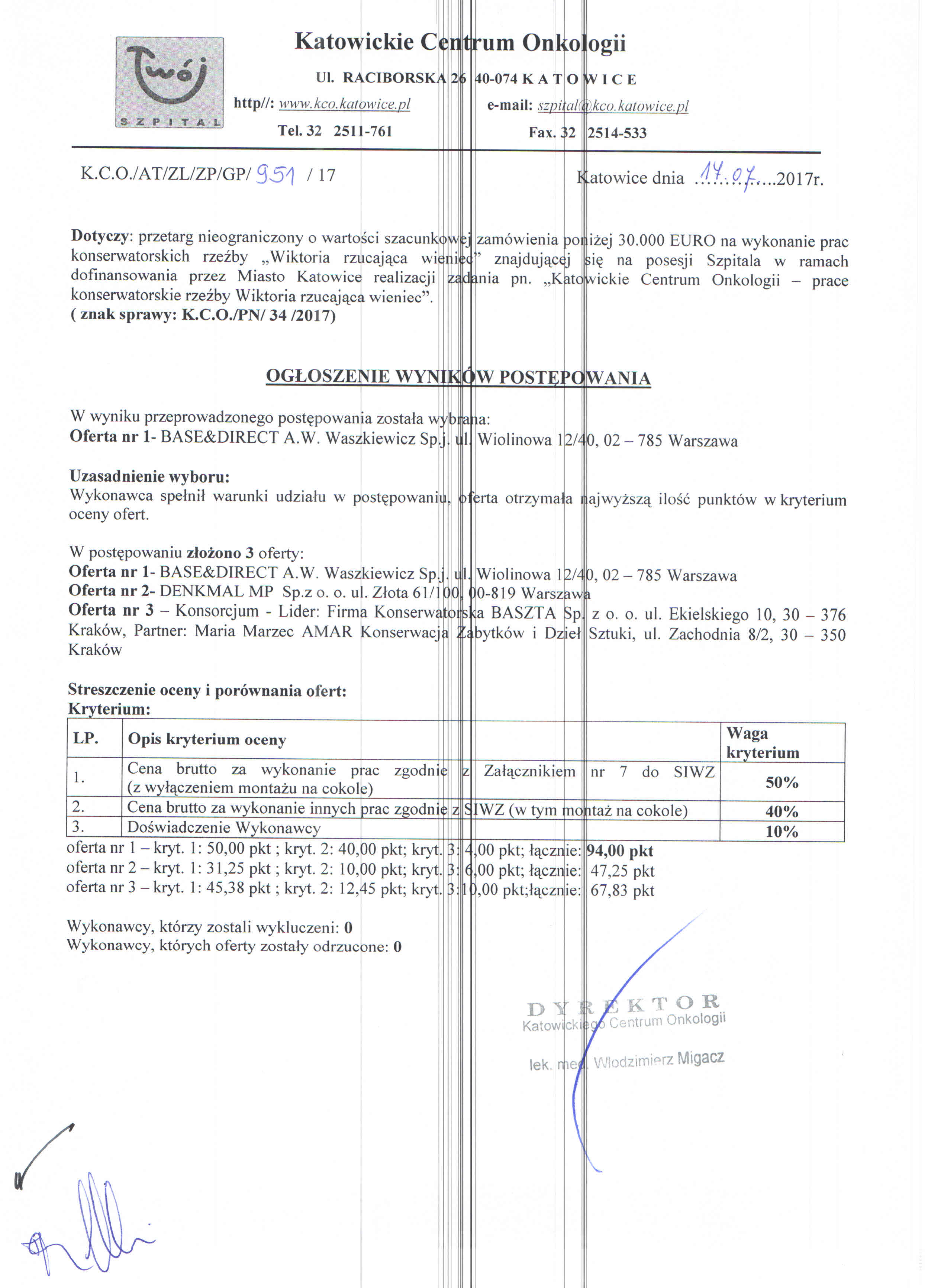 Przedmiotem zamówienia jest wykonanie prac konserwatorskich rzeźby "Wiktoria rzucająca wieniec" znajdującej się na posesji Szpitala w ramach dofinansowania przez Miasto Katowice realizacji zadania pn. "Katowickie Centrum Onkologii – prace konserwatorskie rzeźby Wiktoria rzucająca wieniec".