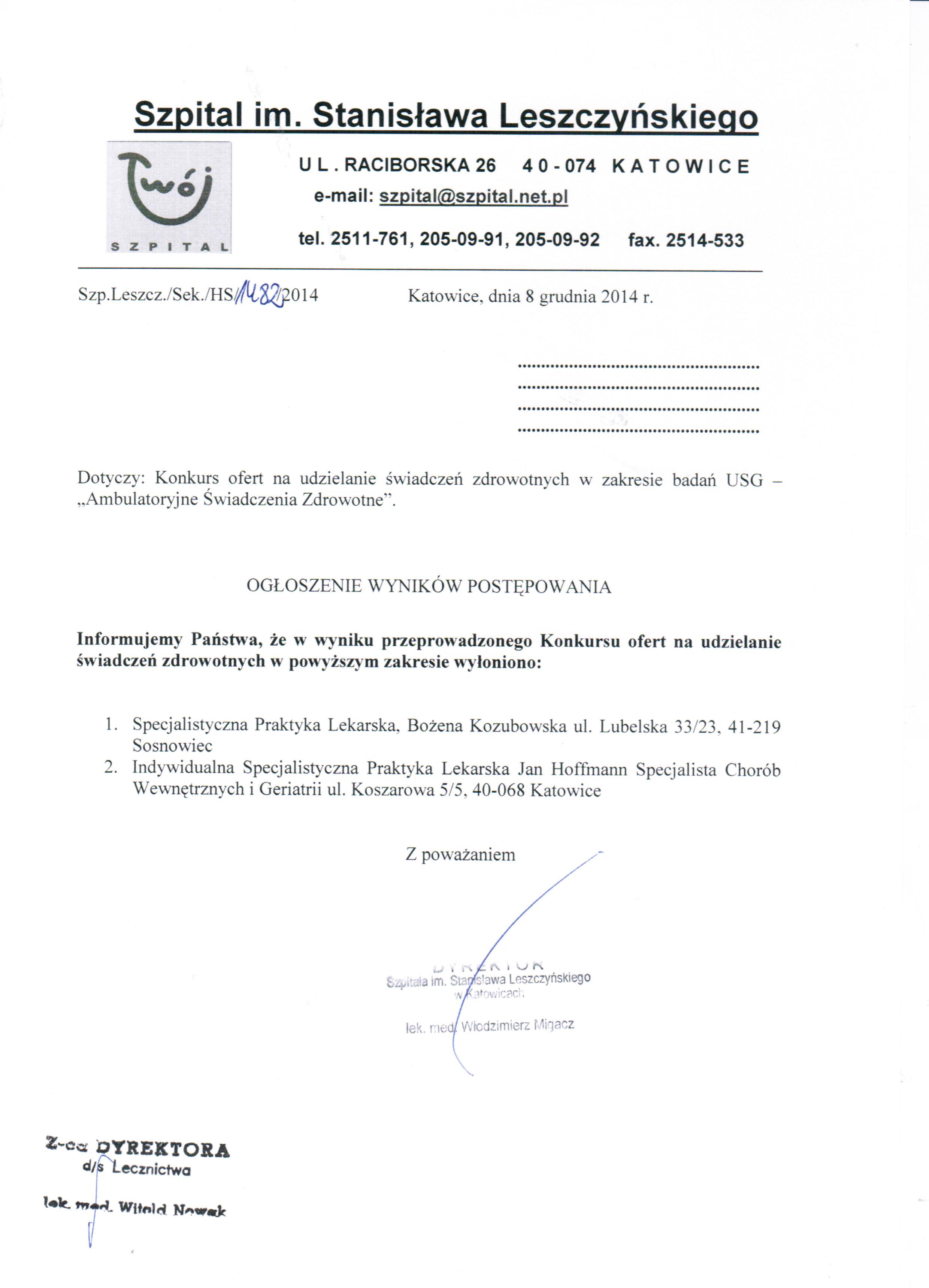 - Otwarcie ofert nastąpi w budynku Dyrekcji Szpitala im. Stanisława Leszczyńskiego, Raciborska 26, I piętro, Sala Konferencyjna w dniu 05.12.2014 r. o godz. 11.00