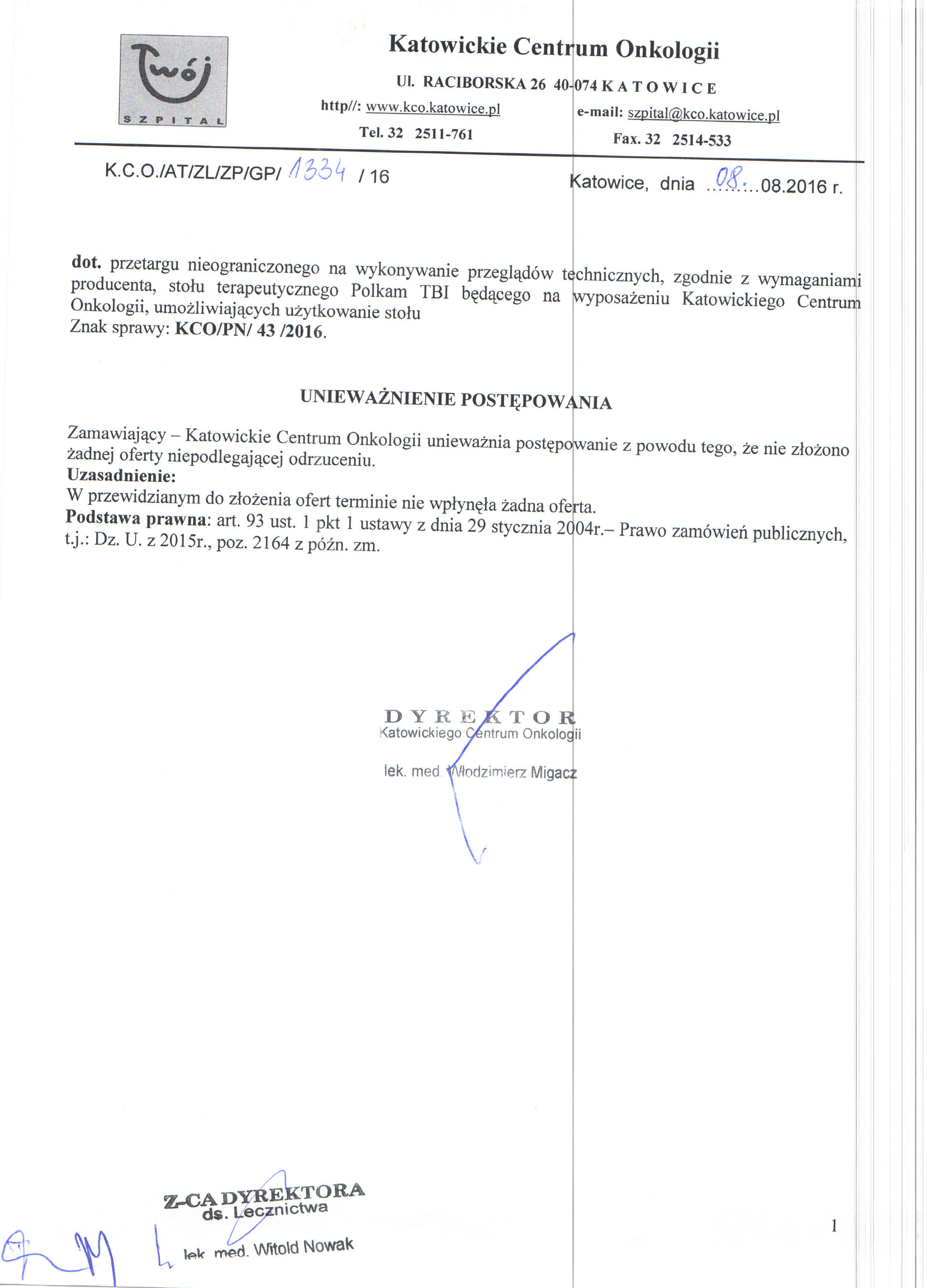 ogłasza przetarg nieograniczony o wartości szacunkowej zamówienia poniżej 30.000 EURO na wykonywanie przeglądów technicznych, zgodnie z wymaganiami producenta, stołu terapeutycznego Polkam TBI będącego na wyposażeniu Katowickiego Centrum Onkologii, umożliwiających użytkowanie stołu