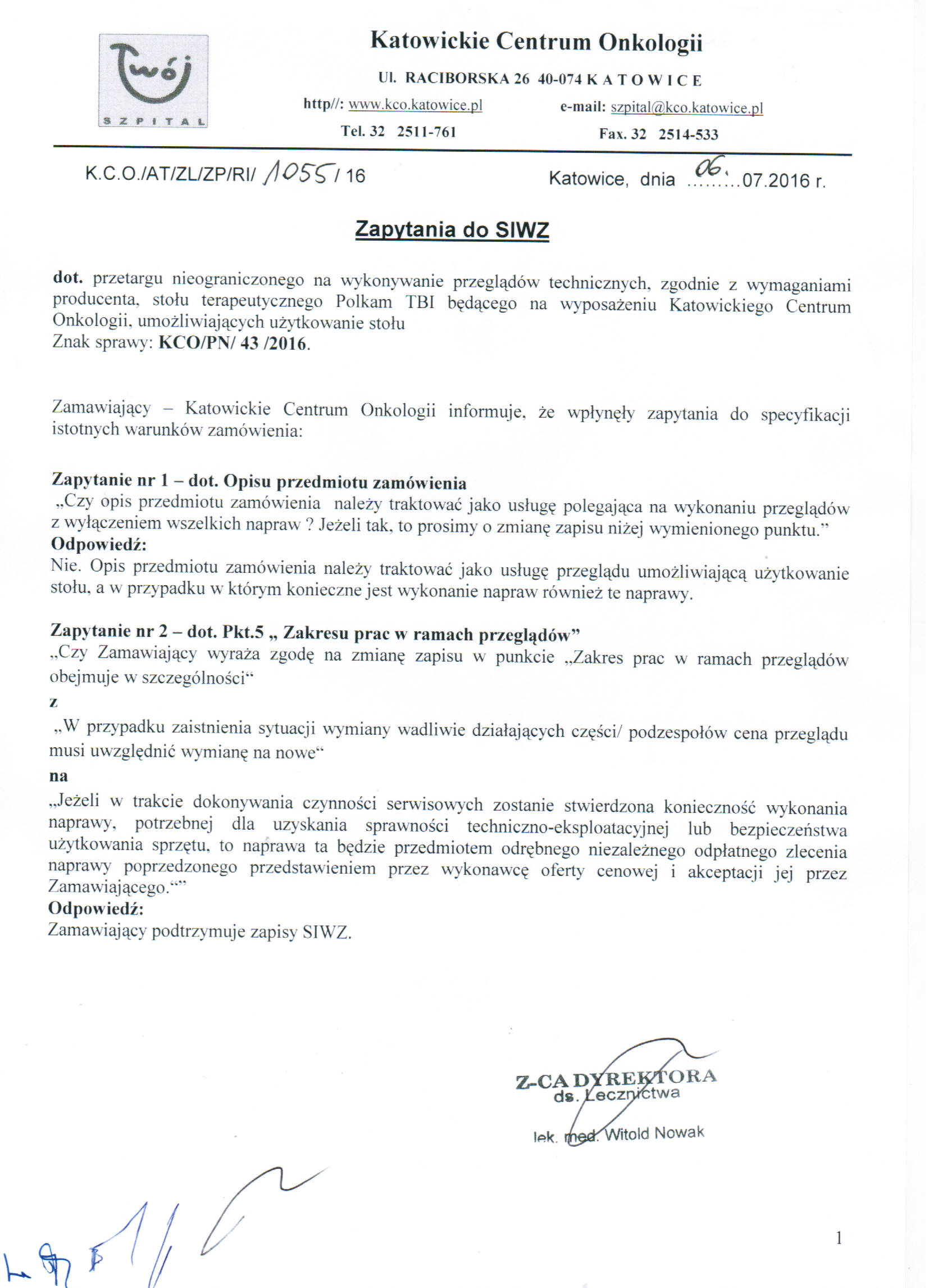 w dniu 08.07.2016 r. o godz. 11:00 w Katowickim Centrum Onkologii, ul. Raciborska 28, budynek Przychodni, II piętro, Sekcja Zamówień Publicznych.
