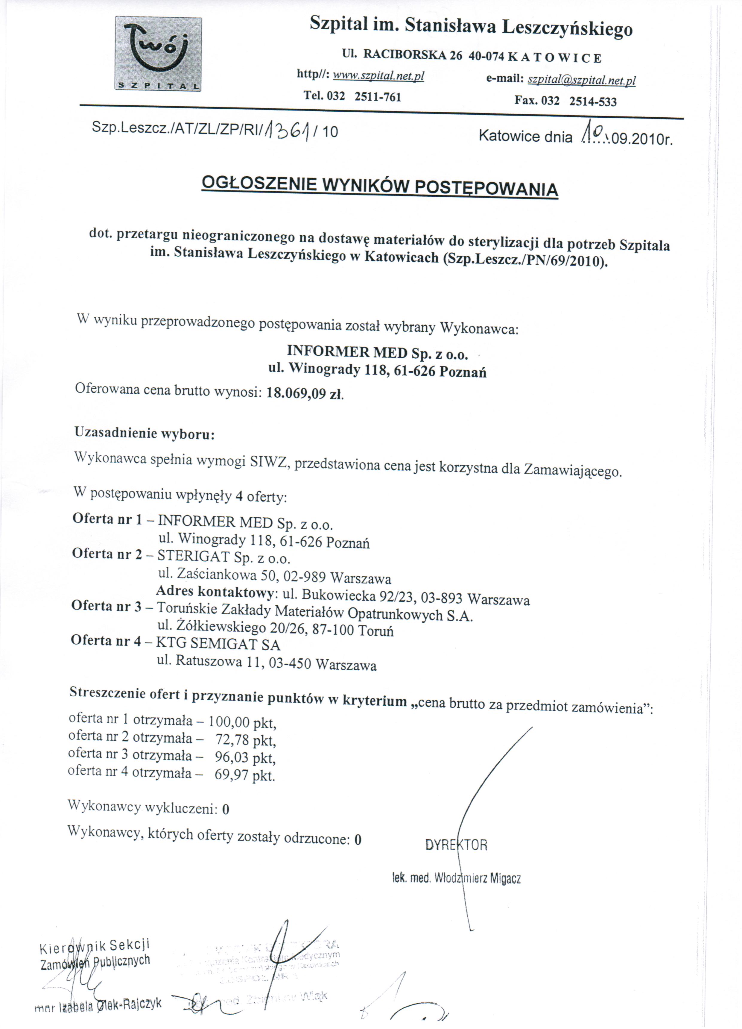w dniu 23.08.2010r. o godz. 11:00 w 40-074 Katowice, ulica Raciborska 28, budynek Przychodni, II piętro, Sekcja Zamówień Publicznych.