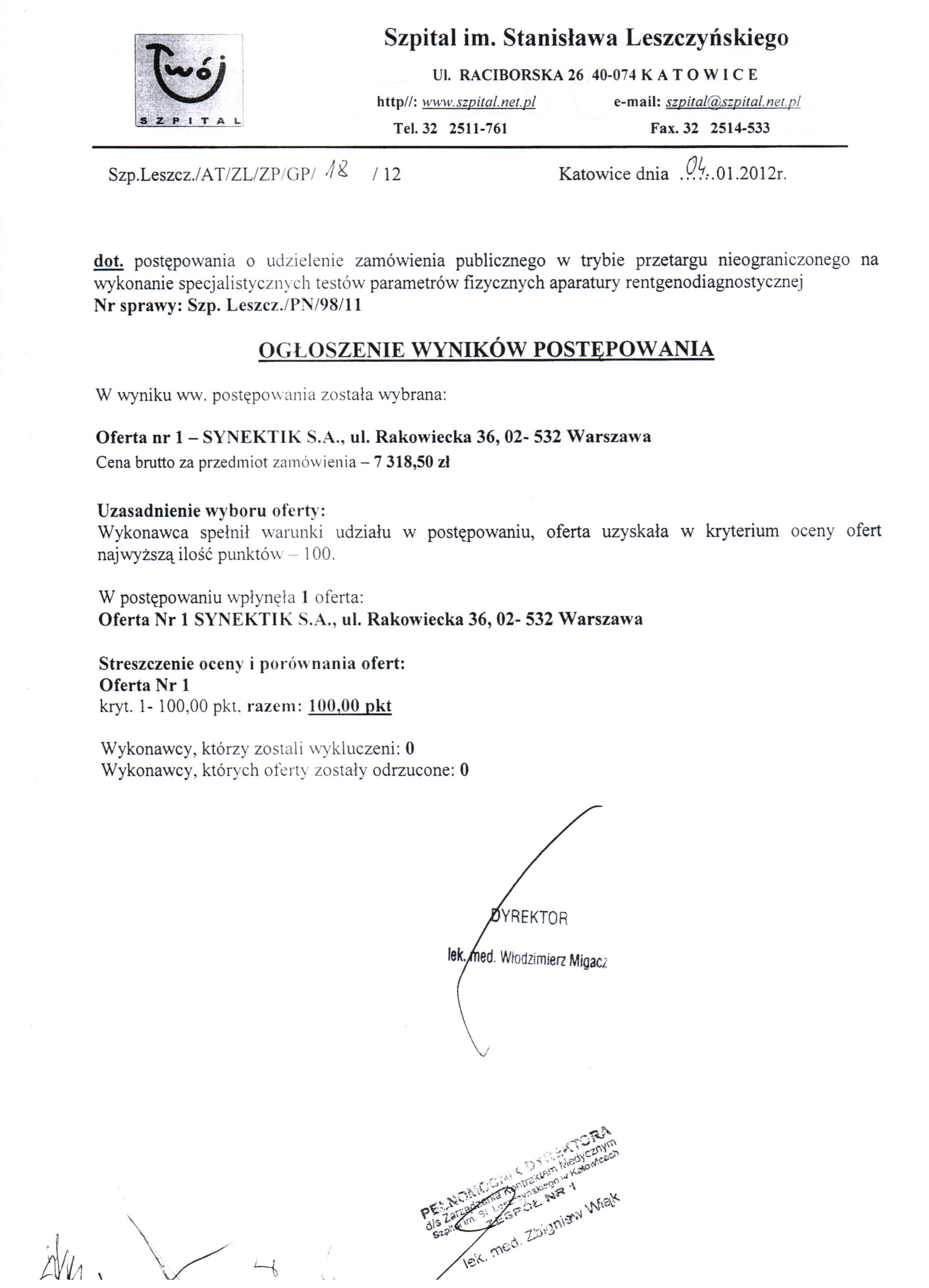 Ogłoszenie wyników postępowania - 04.I.2012r.