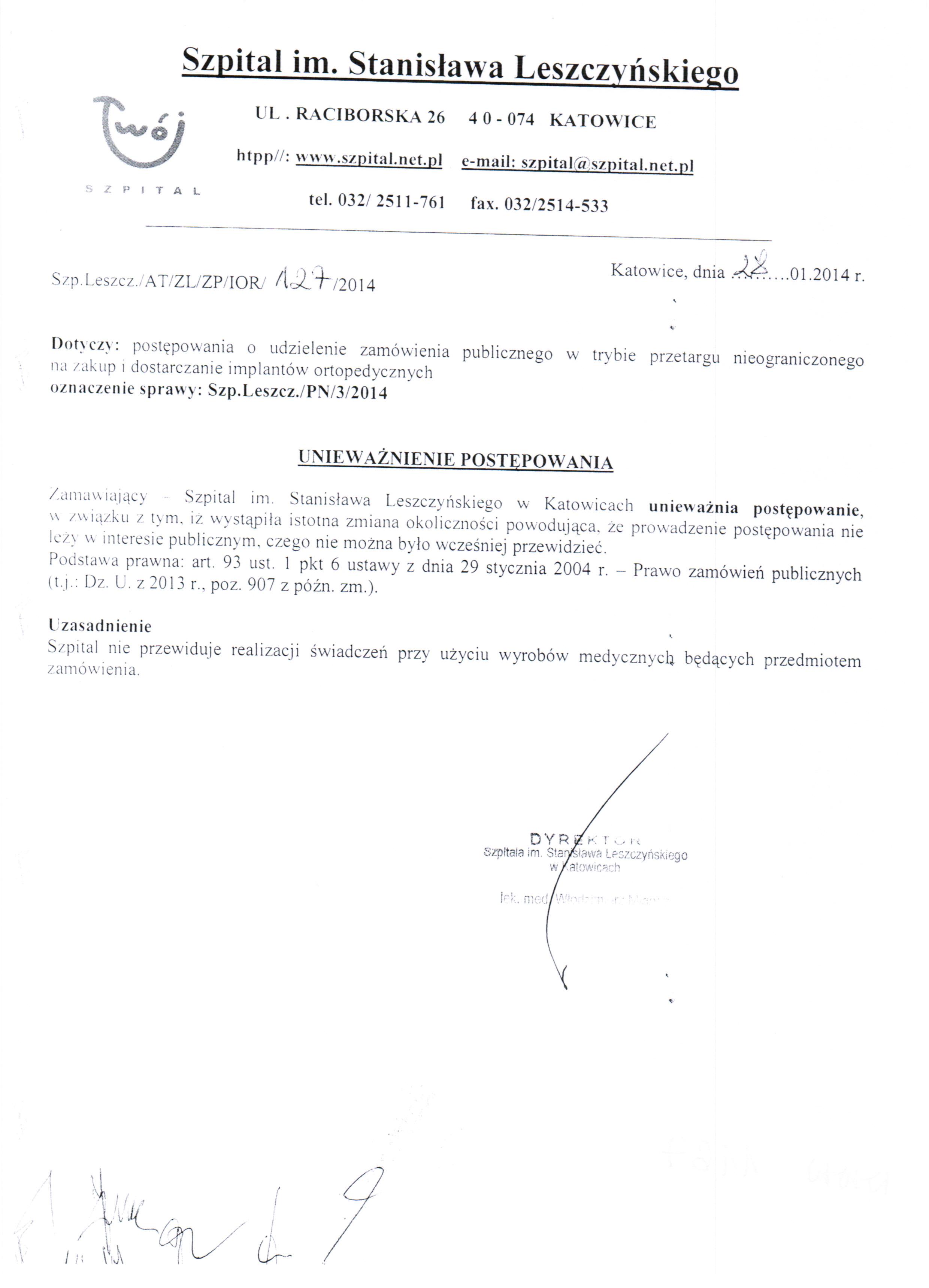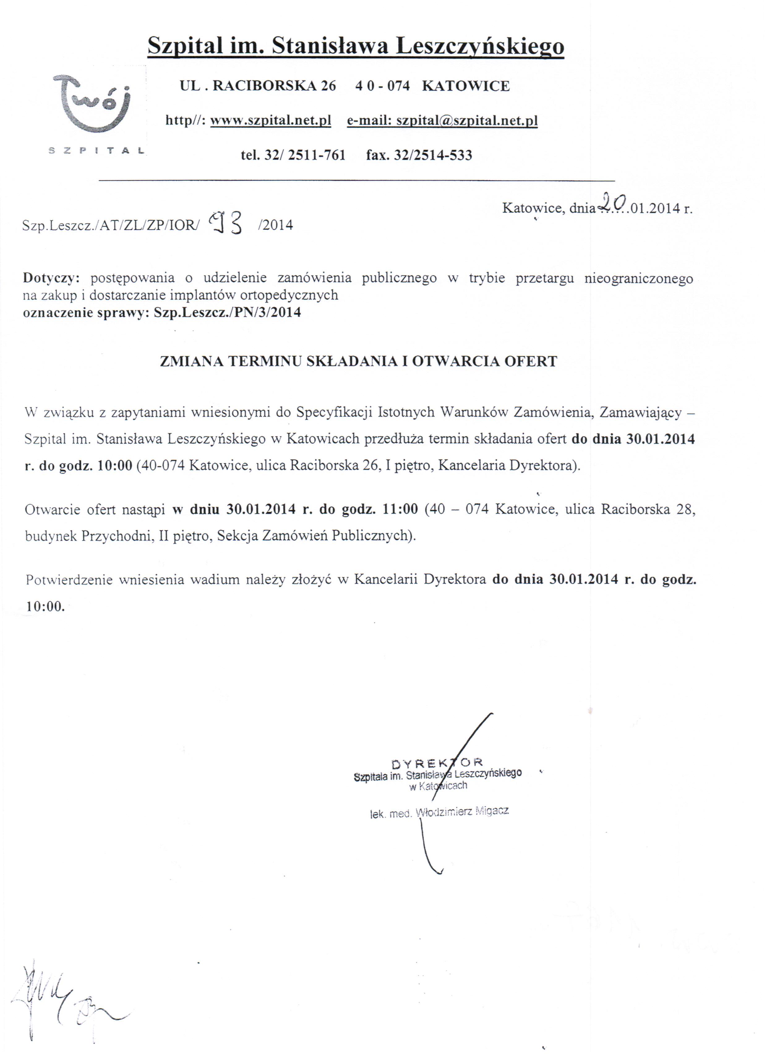 w dniu 21.01.2014r. o godz. 11:00 w 40-074 Katowice, ulica Raciborska 28, budynek Przychodni, II piętro, Sekcja Zamówień Publicznych.