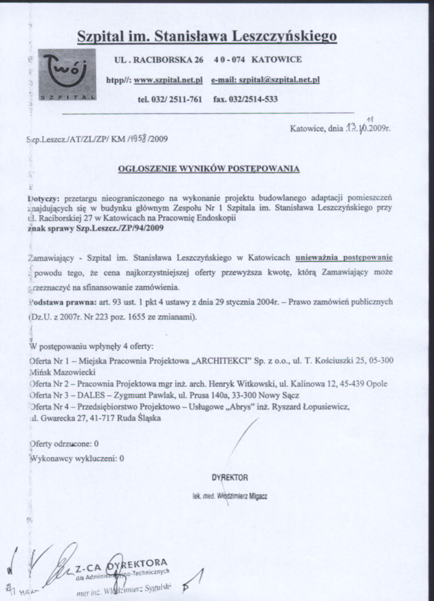 ogłasza przetarg nieograniczony o wartości szacunkowej zamówienia powyżej 14.000 EURO na wykonanie projektu budowlanego adaptacji pomieszczeń znajdujących się w budynku głównym Zespołu Nr 1 Szpitala im. Stanisława Leszczyńskiego przy ul. Raciborskiej 27 w Katowicach na Pracownię Endoskopii