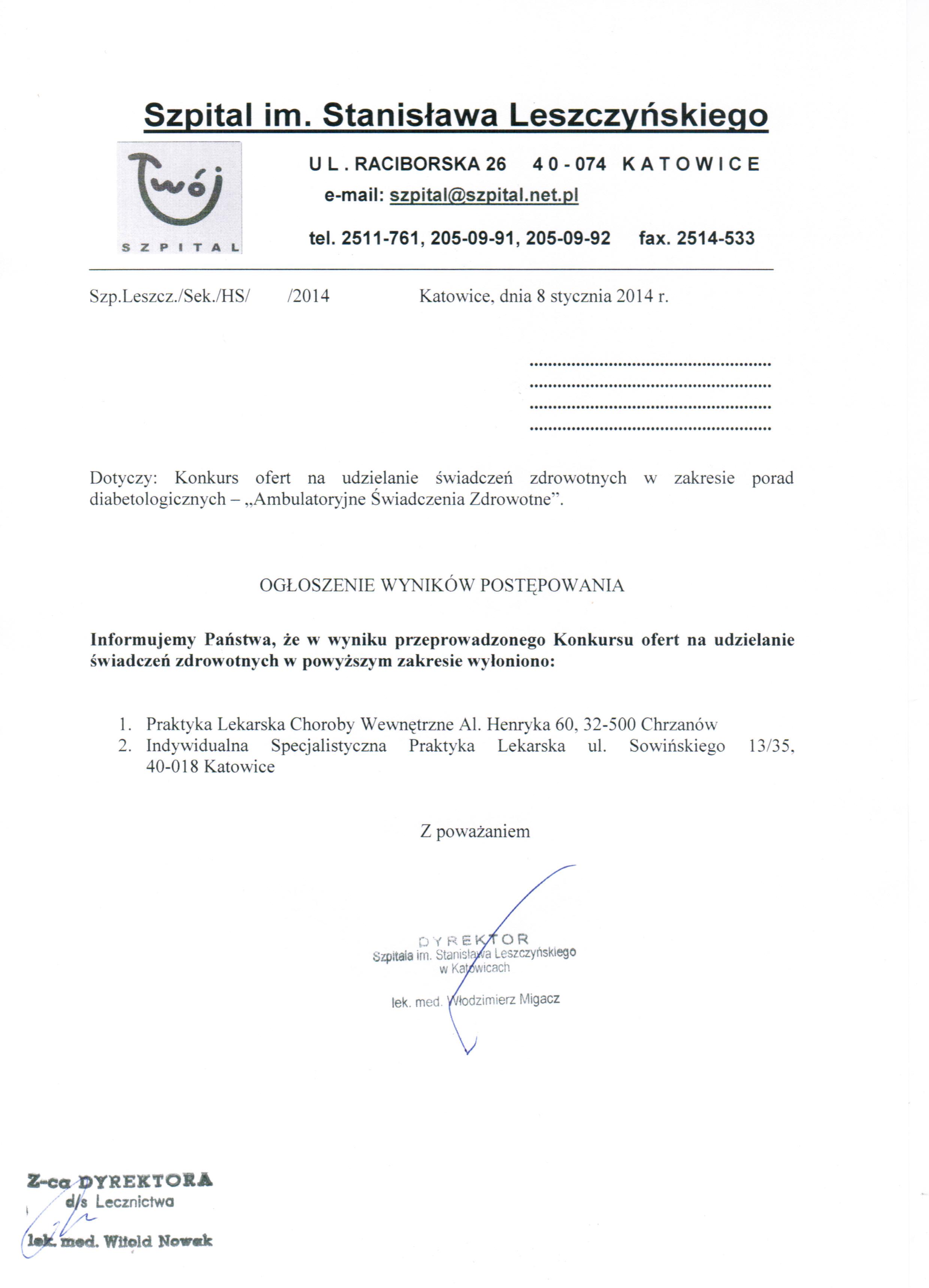 Dodatkowych informacji udziela Z-ca Dyrektora ds. Lecznictwa lek. med. Witold Nowak pod nr tel. (32) 251 17 61.