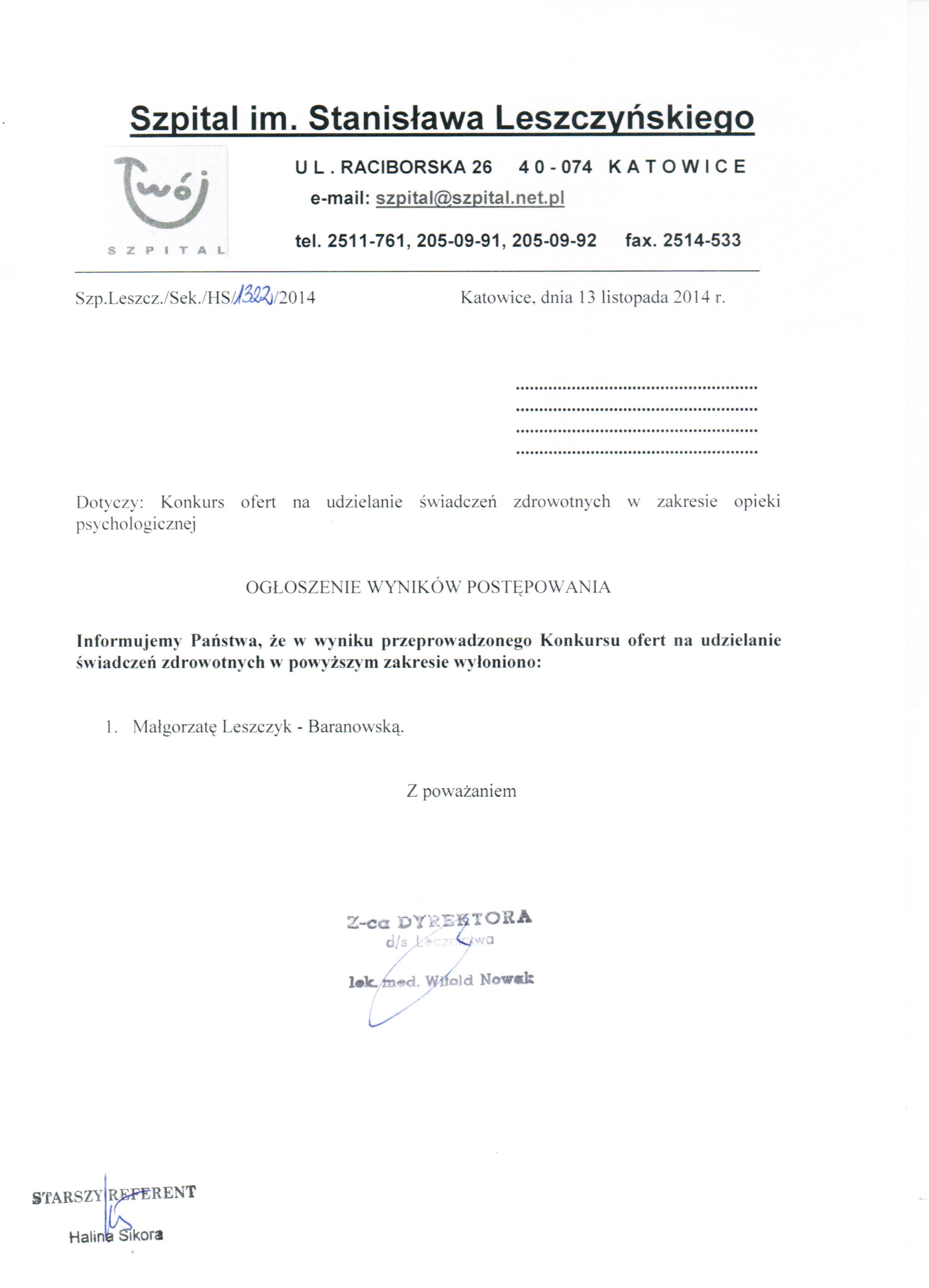 Szpital im. Stanisława Leszczyńskiego w Katowicach ul. Raciborska 26 zwany dalej Udzielającym Zamówienia ogłasza zamówienie na udzielanie świadczeń zdrowotnych w zakresie opieki psychologicznej.