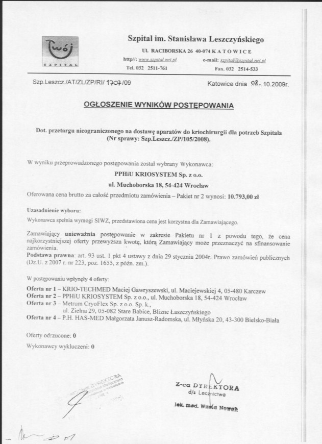 Pakiet nr 1 – aparat do kriochirurgii w ilości 1 szt. dla potrzeb Poradni Ginekologiczno-Położniczej Szpitala
