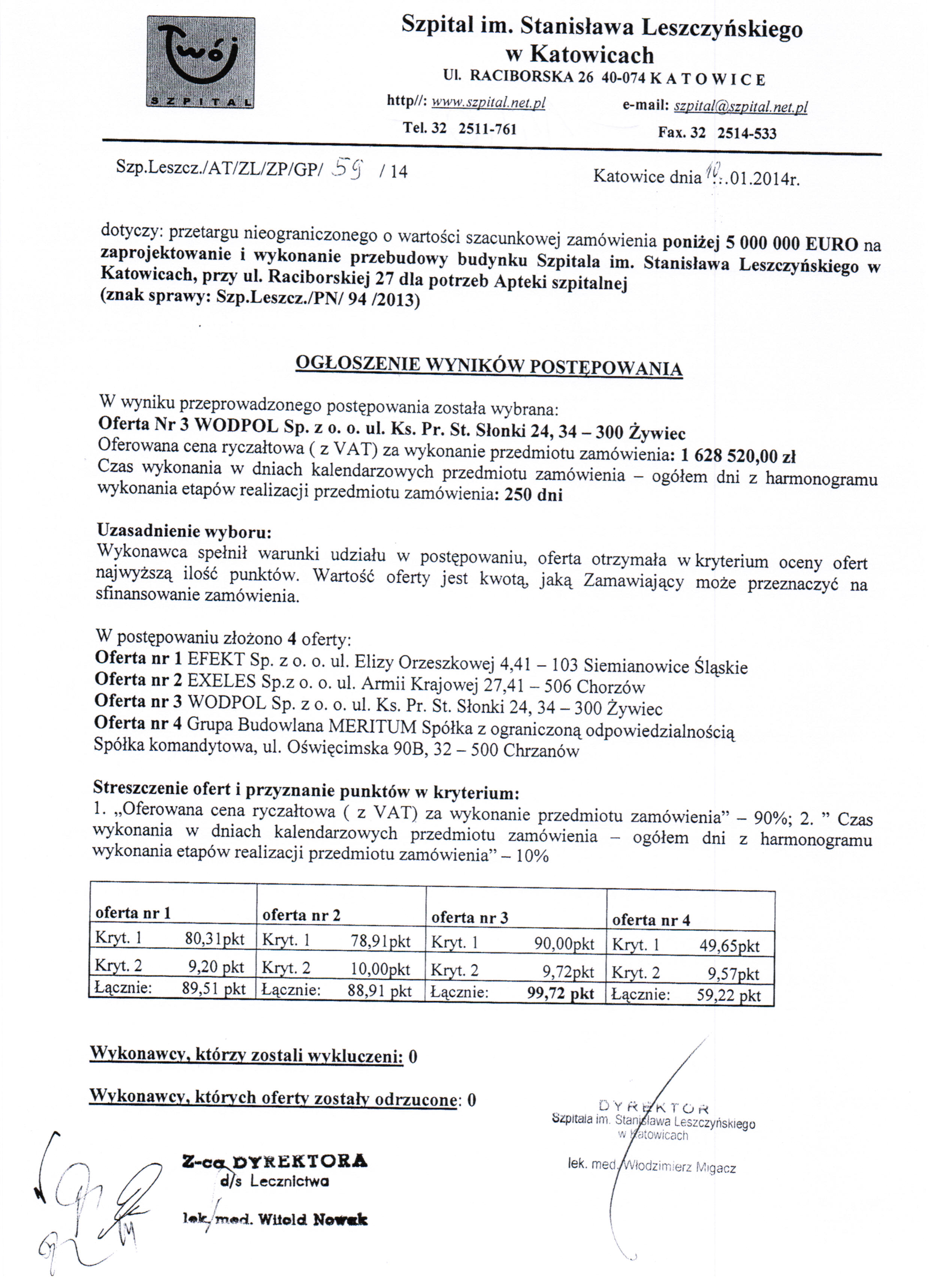 w dniu 18.12.2013r. o godz. 11:00 w Szpitalu im. Stanisława Leszczyńskiego w Katowicach ul. Raciborska 28, budynek Przychodni, II piętro, Sekcja Zamówień Publicznych.