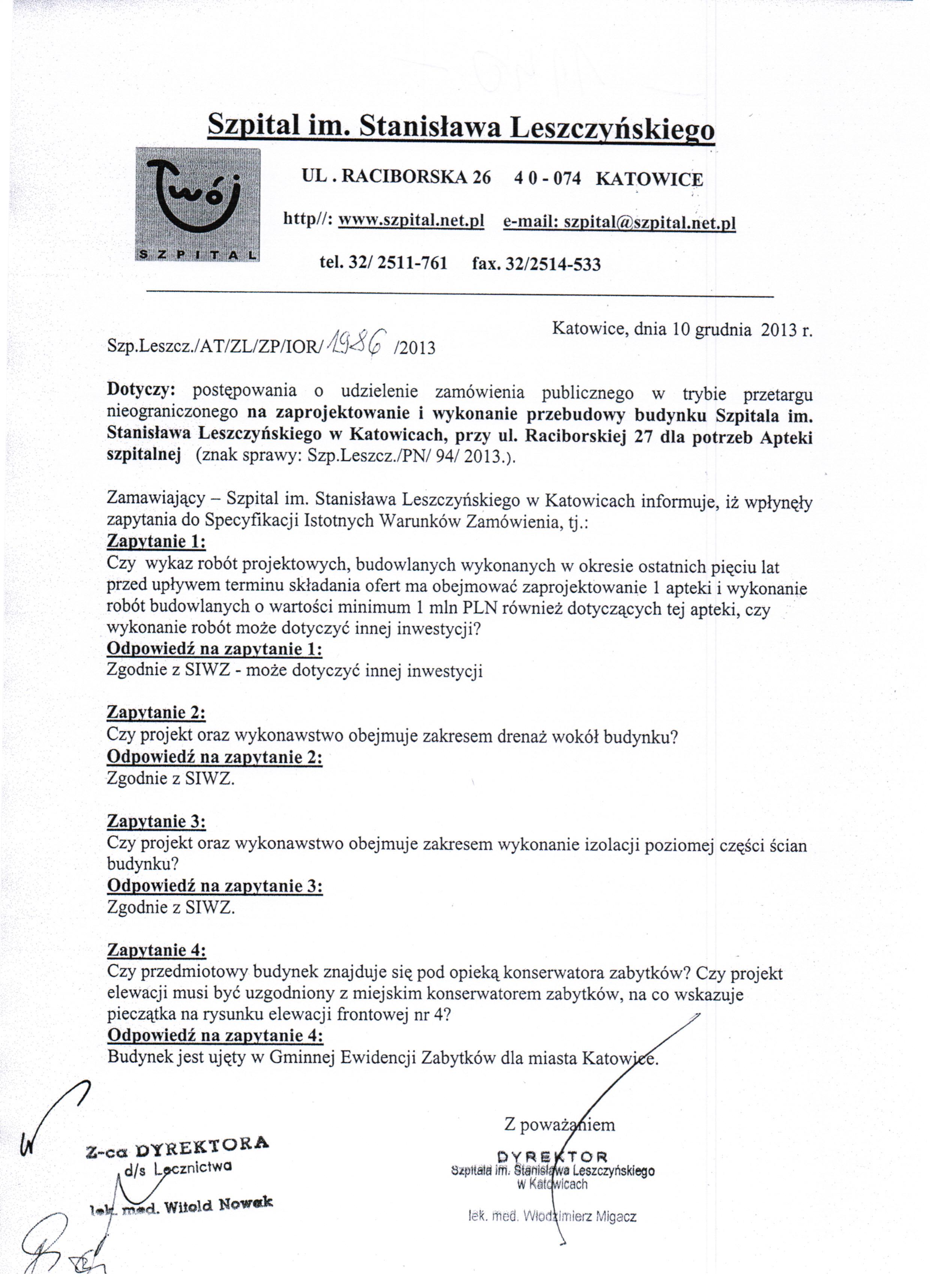 SIWZ można uzyskać pod adresem: Szpital im. Stanisława Leszczyńskiego, 40-074 Katowice, ul. Raciborska 26 – Dział Księgowości.