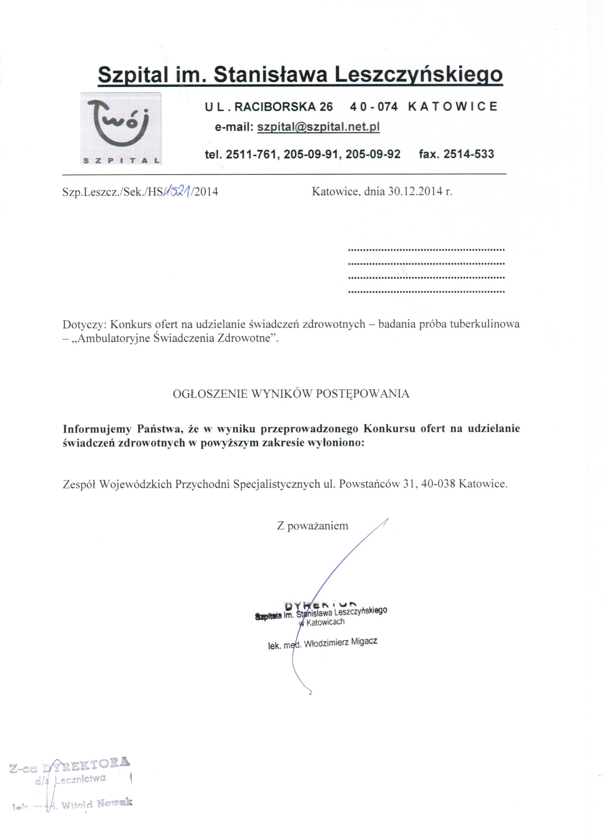 Dodatkowych informacji udziela Z-ca Dyrektora ds. Lecznictwa lek. med. Witold Nowak pod nr tel. (32) 251 17 61.