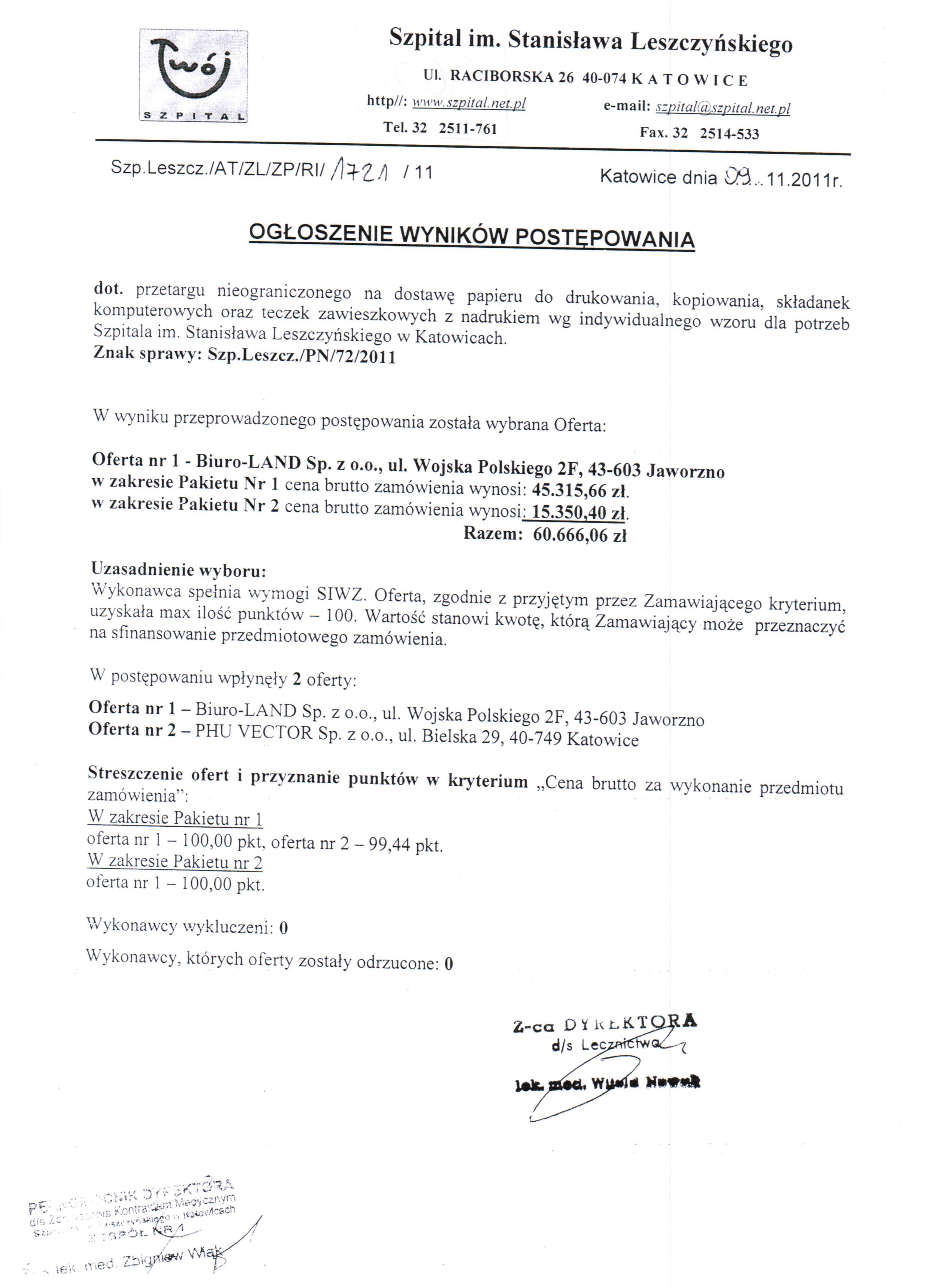 w dniu 26.10. 2011r. o godz. 11:00 w Szpitalu im. Stanisława Leszczyńskiego w Katowicach ul. Raciborska 28, budynek Przychodni, II piętro, Sekcja Zamówień Publicznych.