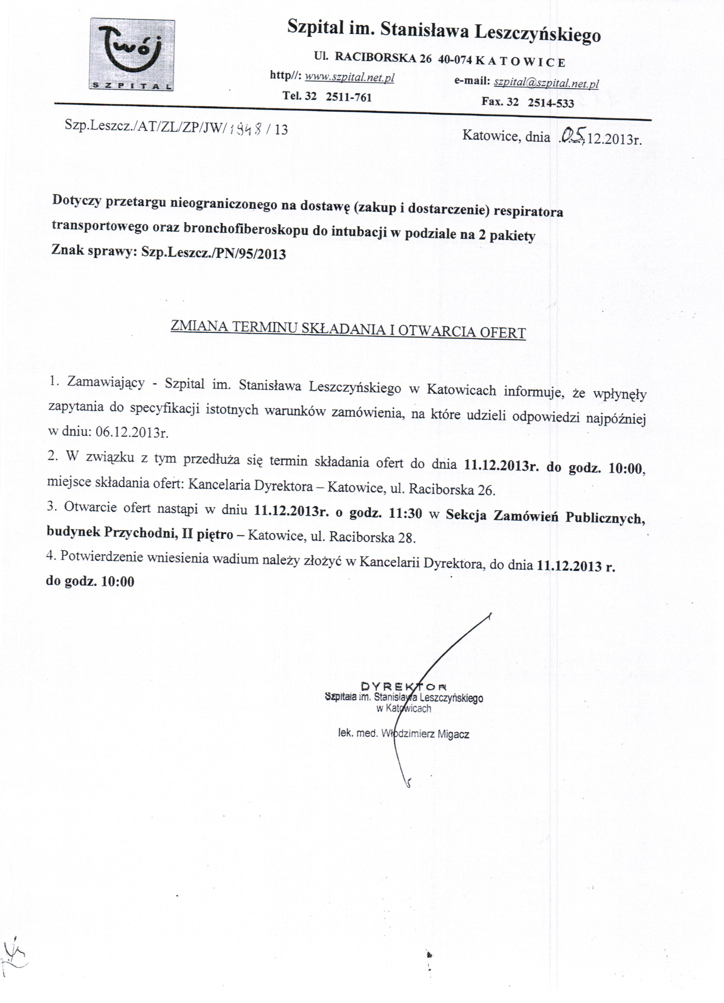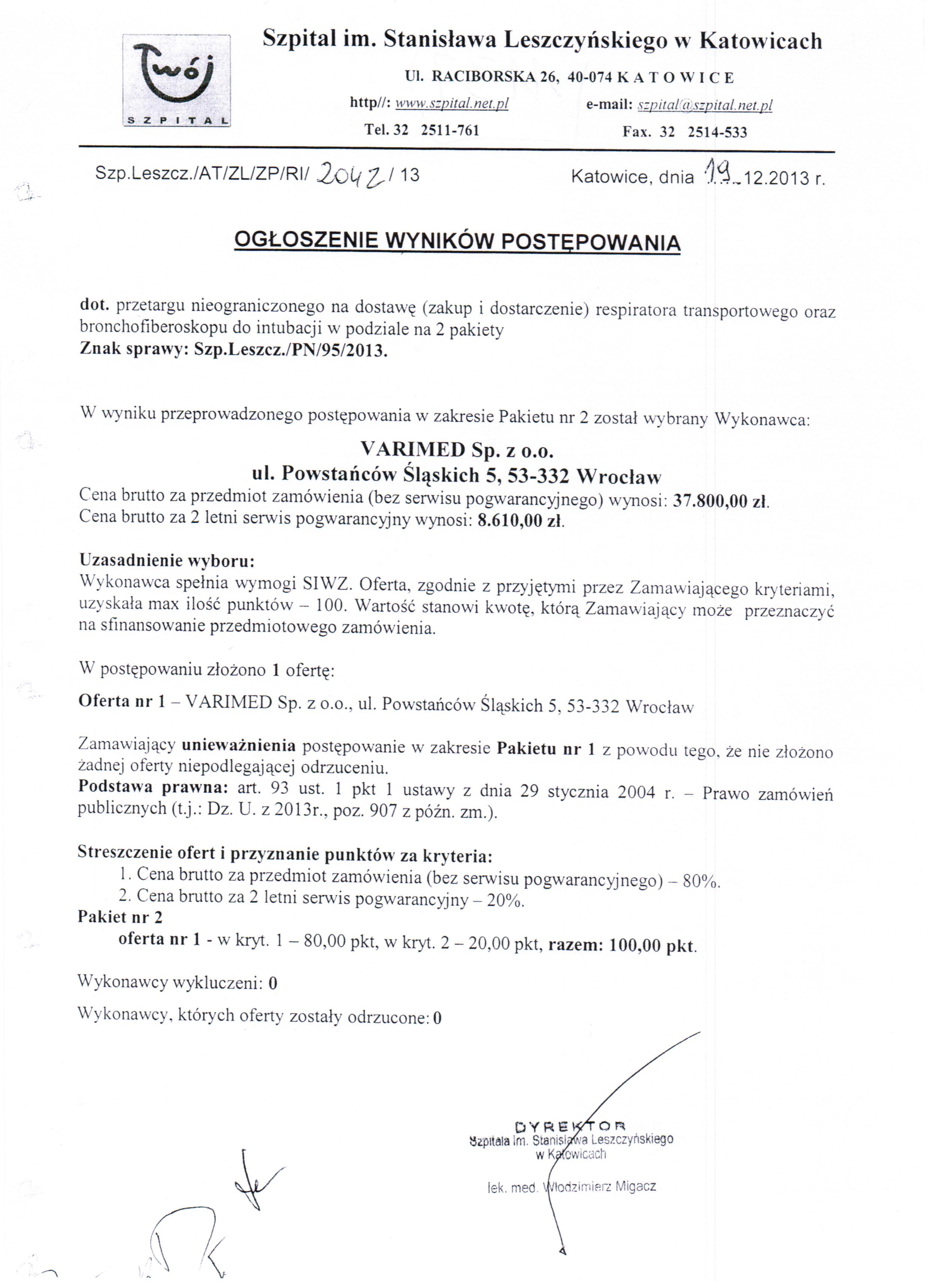 ogłasza przetarg nieograniczony o wartości szacunkowej zamówienia powyżej 14.000 EURO na dostawę (zakup i dostarczanie) respiratora transportowego oraz bronchofiberoskopu do intubacji w podziale na 2 pakiety.