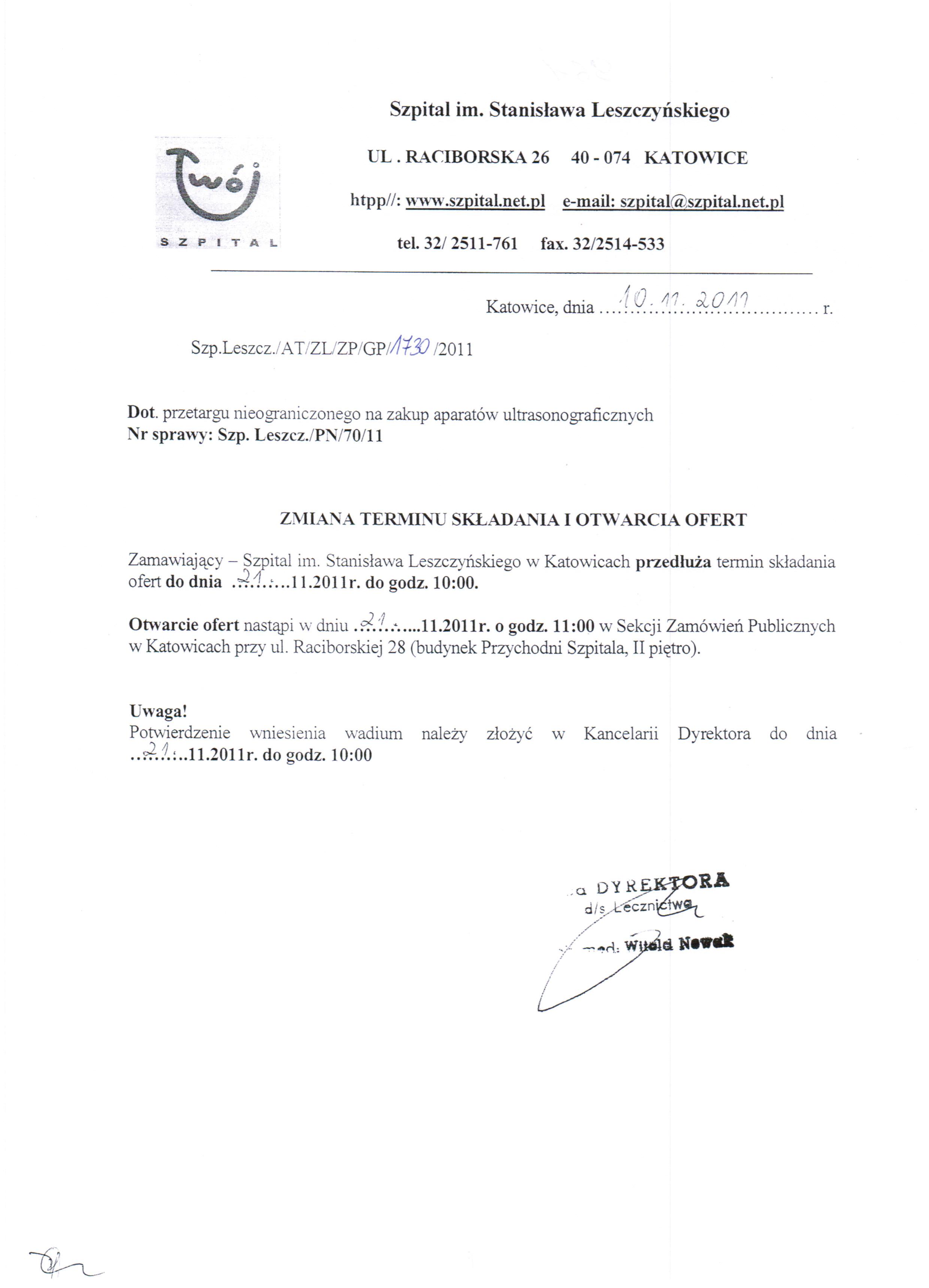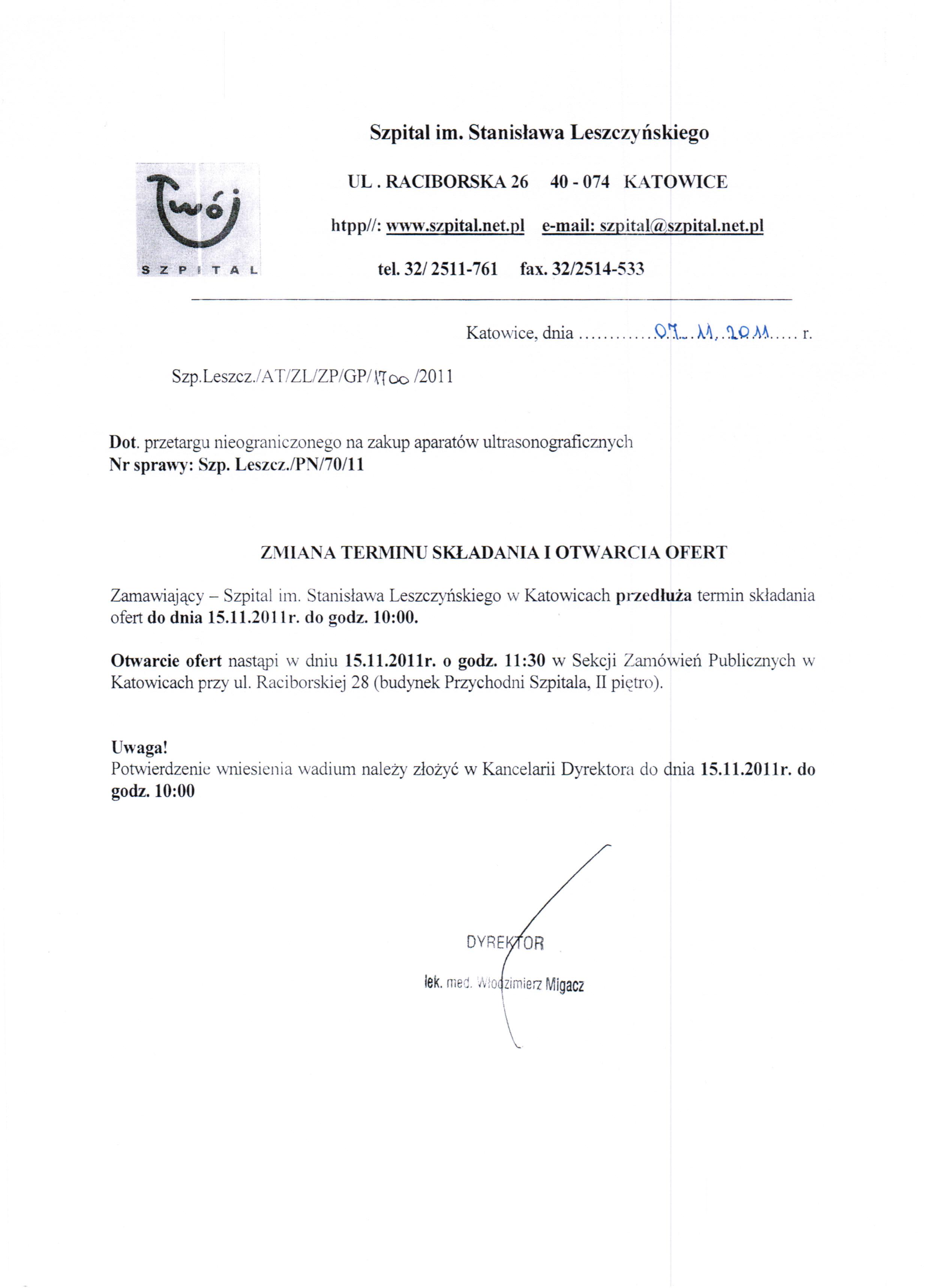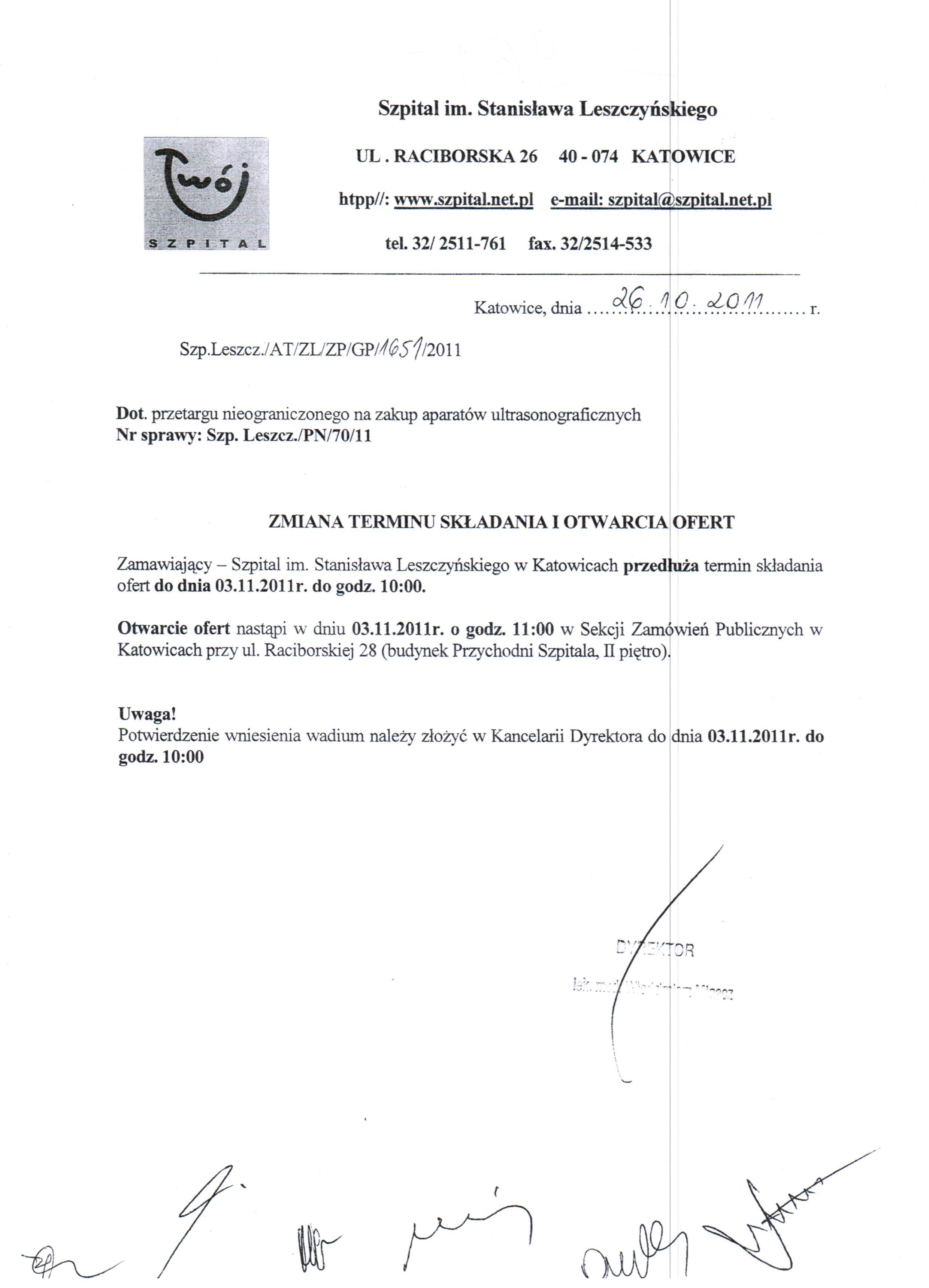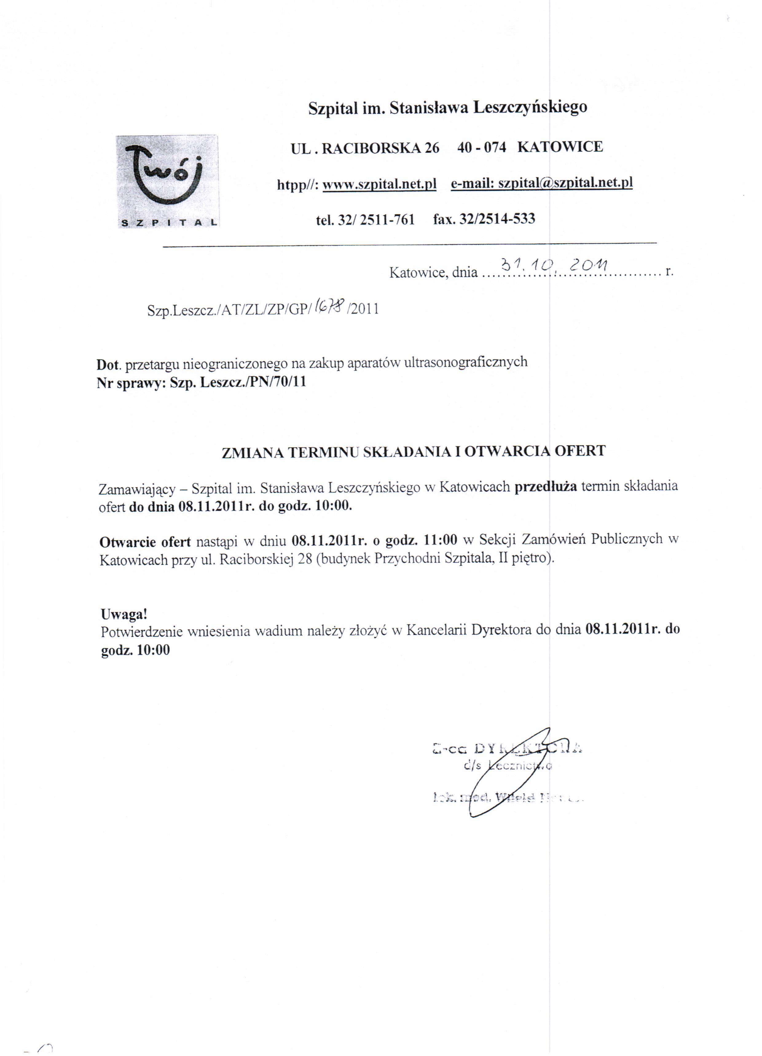 Otwarcie ofert nastąpi w dniu 28.10.2011r. o godz. 11:00 w 40– 074 Katowice, ulica Raciborska 28, budynek Przychodni, II piętro, Sekcja Zamówień Publicznych.