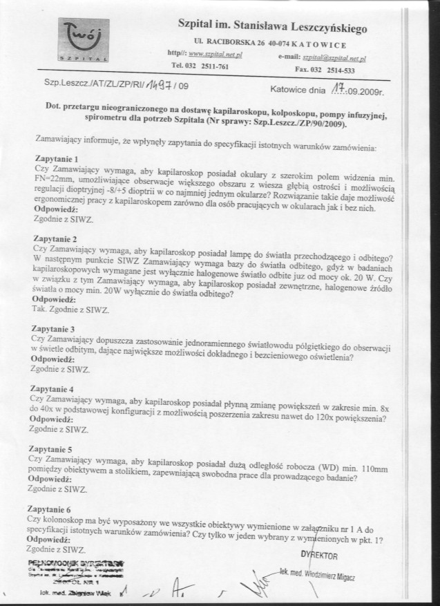do dnia 22.09.2009r. do godz. 10.00 w Kancelarii Dyrektora Szpitala w Katowicach przy ul. Raciborskiej 26