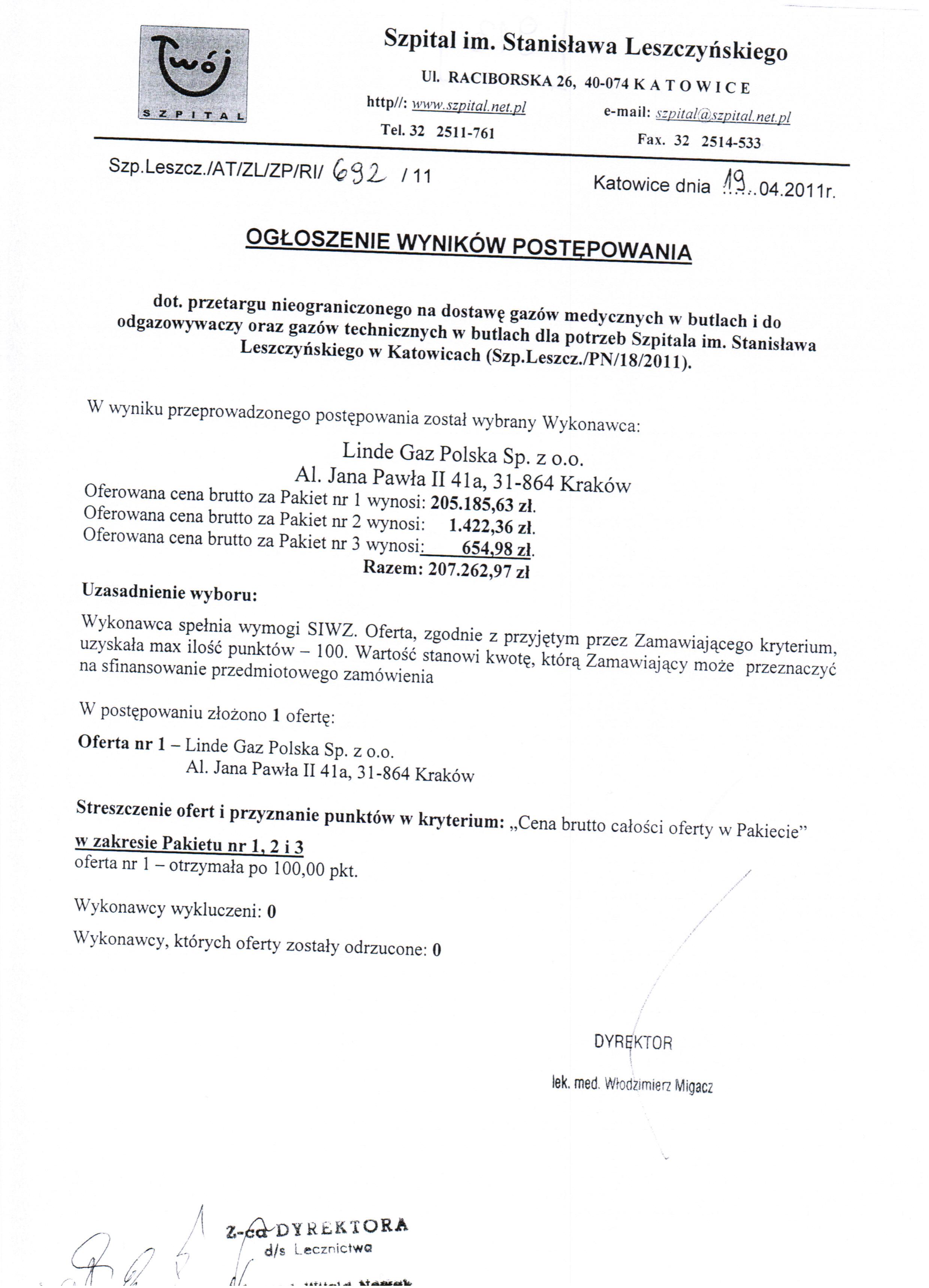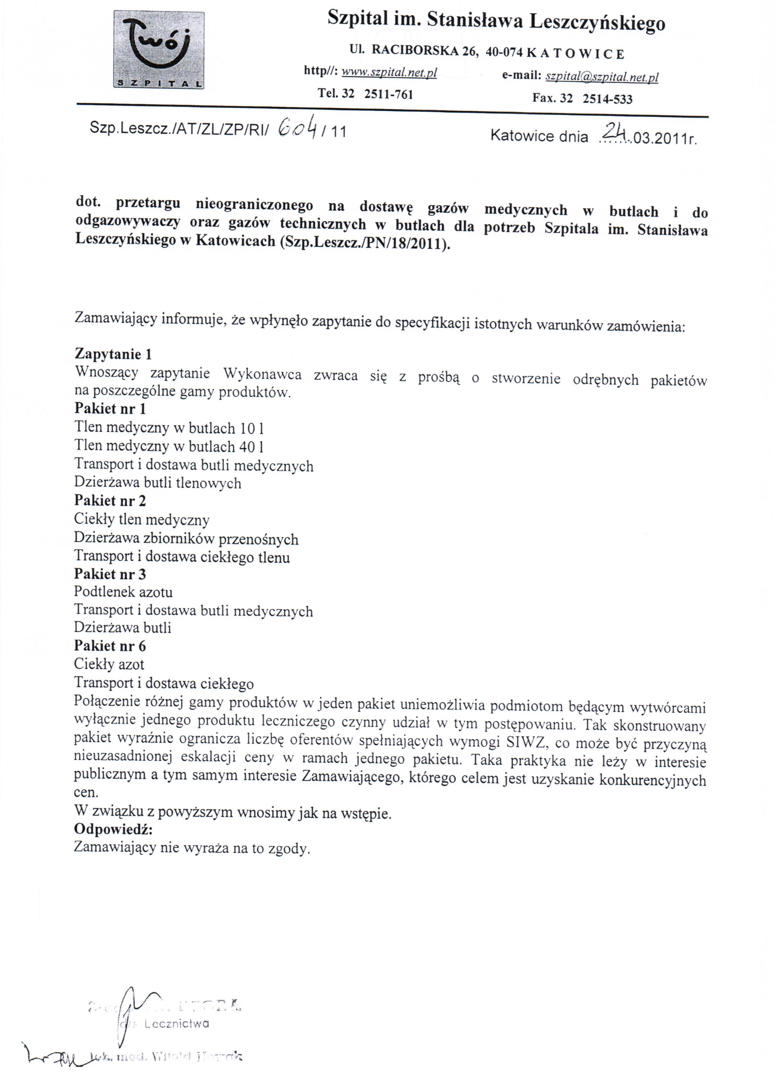 Oferty należy złożyć do dnia 28.03.2011r. do godz. 10:00 w Szpitalu im. Stanisława Leszczyńskiego w Katowicach ul. Raciborska 26 – Kancelaria Dyrektora.