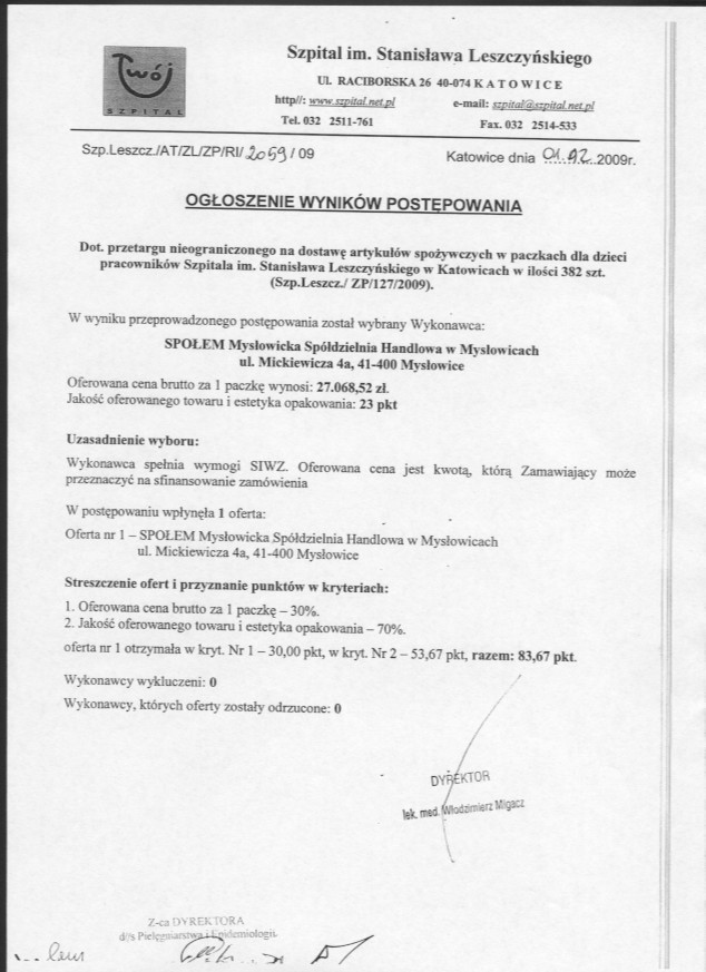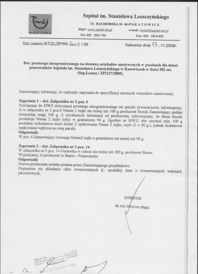 do dnia 27.11.2009r. do godz. 10:00 w Szpitalu im. Stanisława Leszczyńskiego w Katowicach ul. Raciborska 26 w Kancelarii Dyrektora Szpitala.