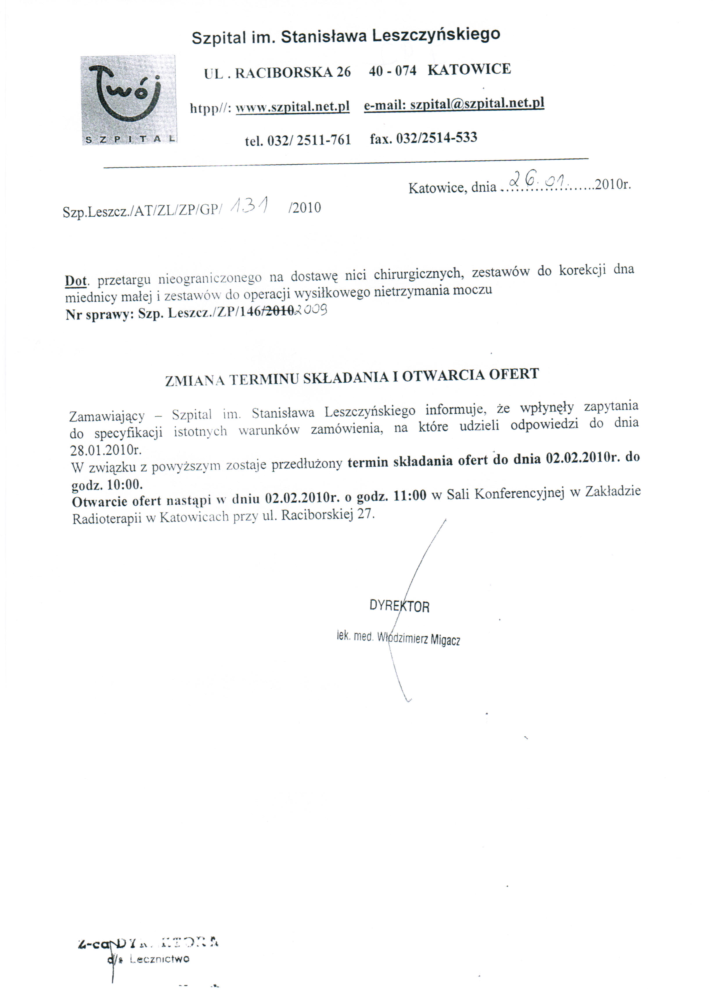 Oferty należy złożyć do dnia 28.01.2010r. do godz. 10.00, w Szpitalu im. Stanisława Leszczyńskiego w Katowicach ul. Raciborska 26, w Kancelarii Dyrektora Szpitala.
