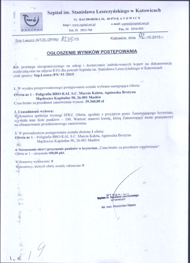 w dniu 25.09.2015 r. o godz. 11:00 w Szpitalu im. Stanisława Leszczyńskiego w Katowicach, ul. Raciborska 28, budynek Przychodni, II piętro, Sekcja Zamówień Publicznych.