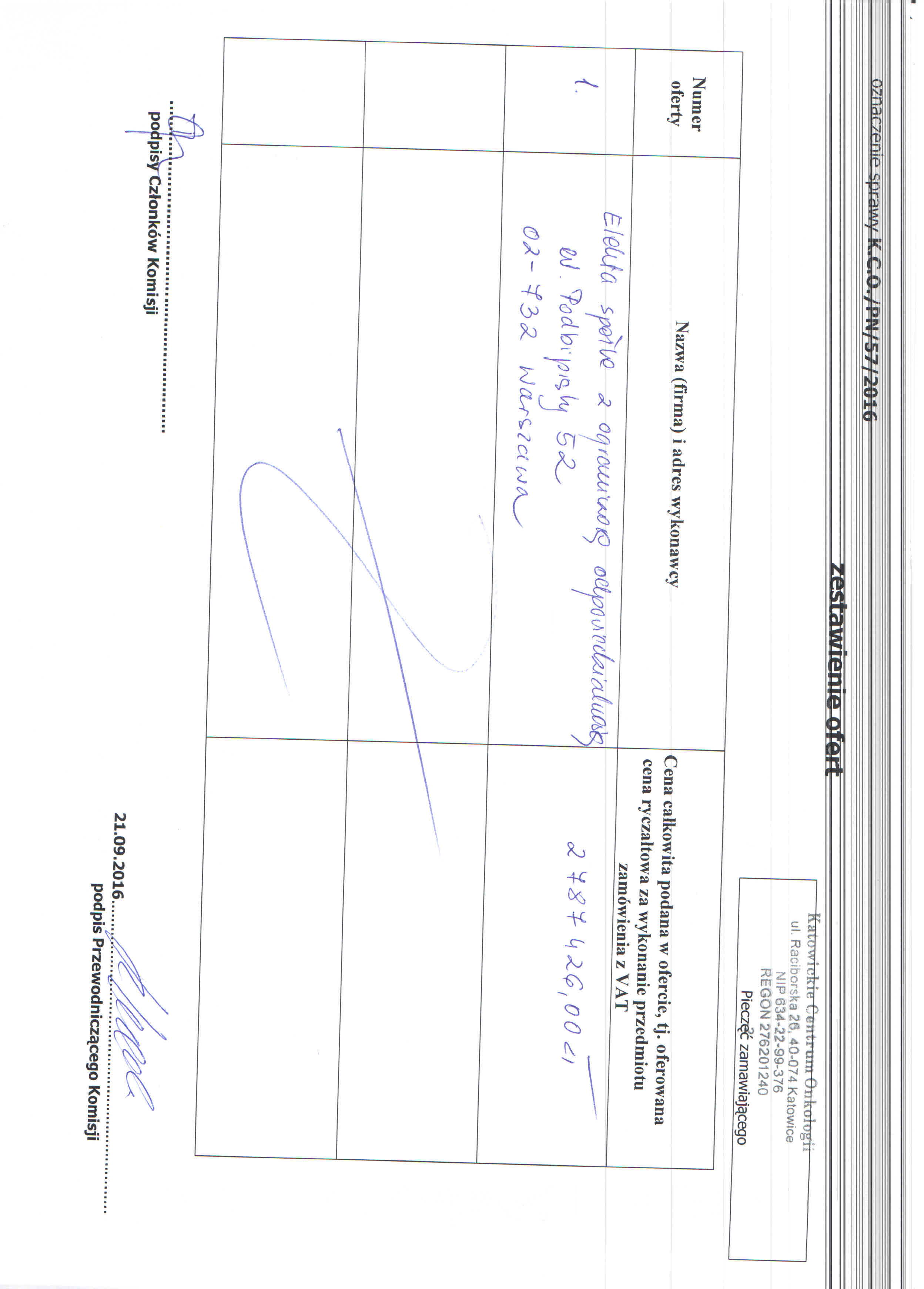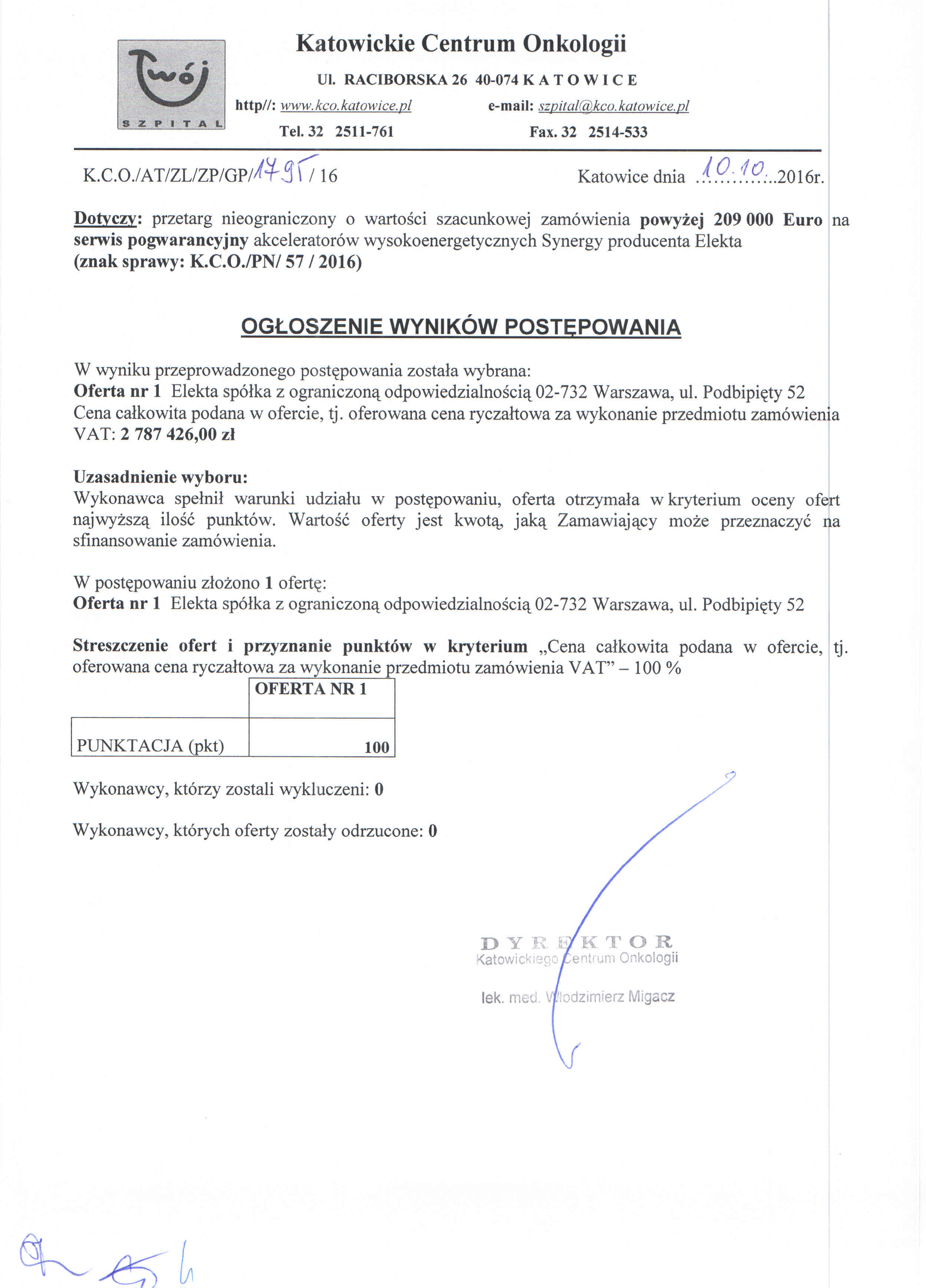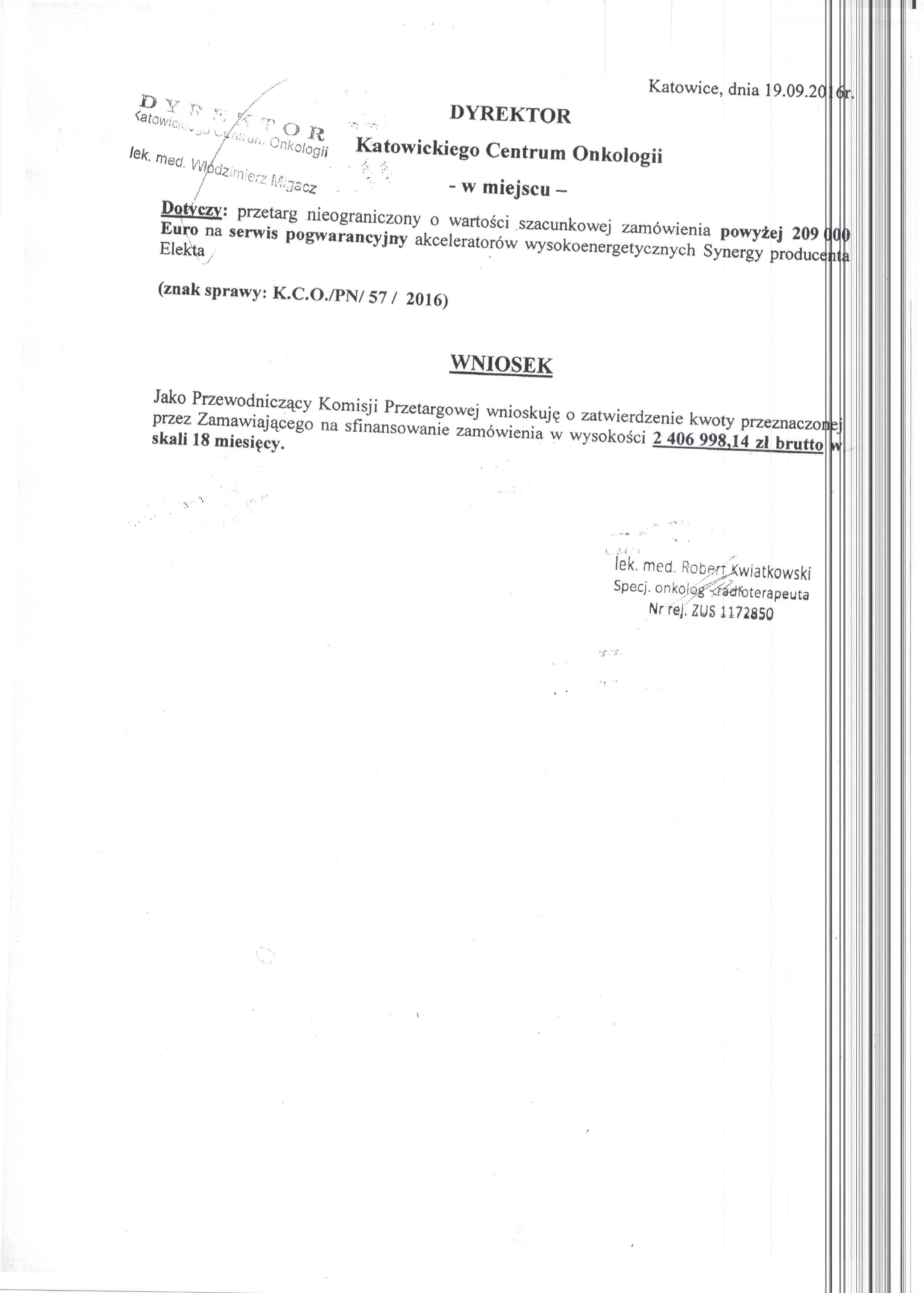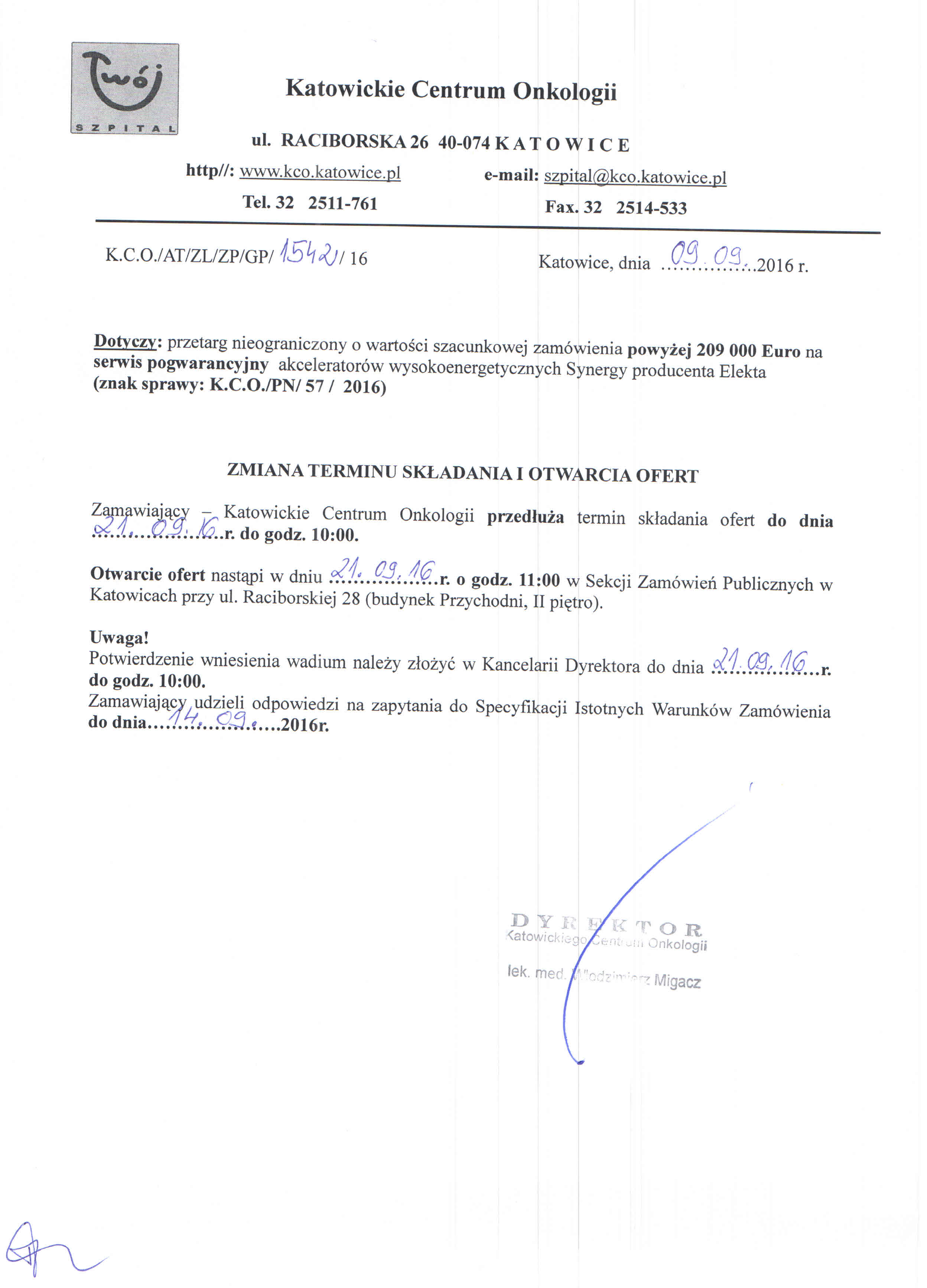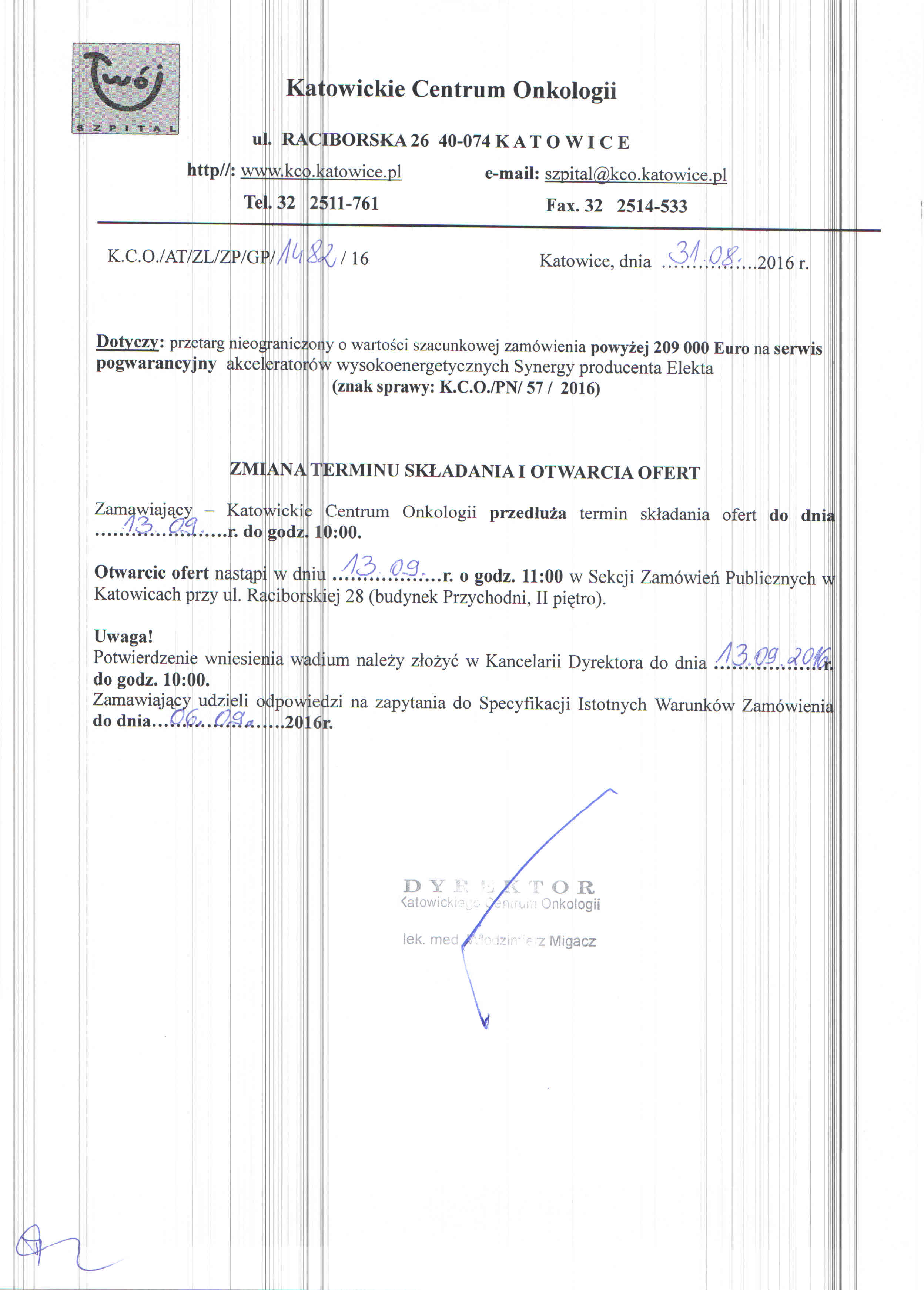 w dniu 05.09.2016r. o godz. 11:00 w Katowickim Centrum Onkologii, ul. Raciborska 28, budynek Przychodni, II piętro, Sekcja Zamówień Publicznych.