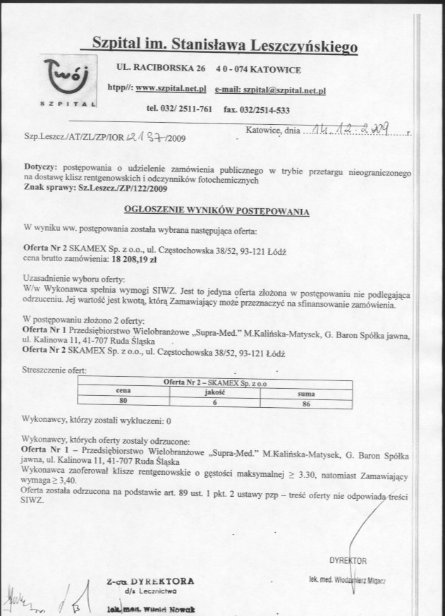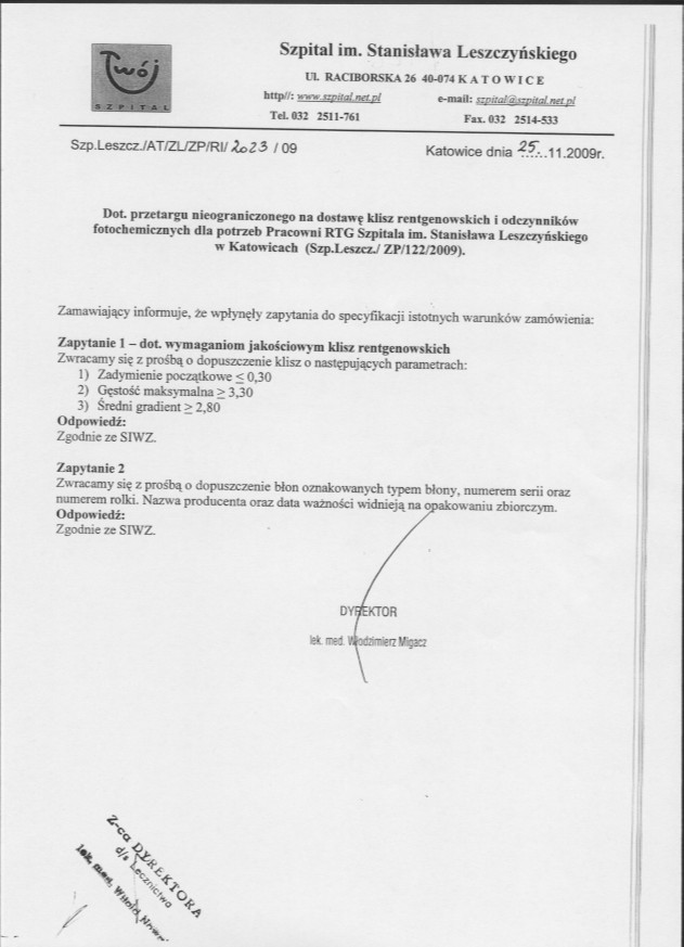 do dnia 30.11.2009r. do godz. 10:00 w Kancelarii Dyrektora Szpitala w Katowicach przy ul. Raciborskiej 26.