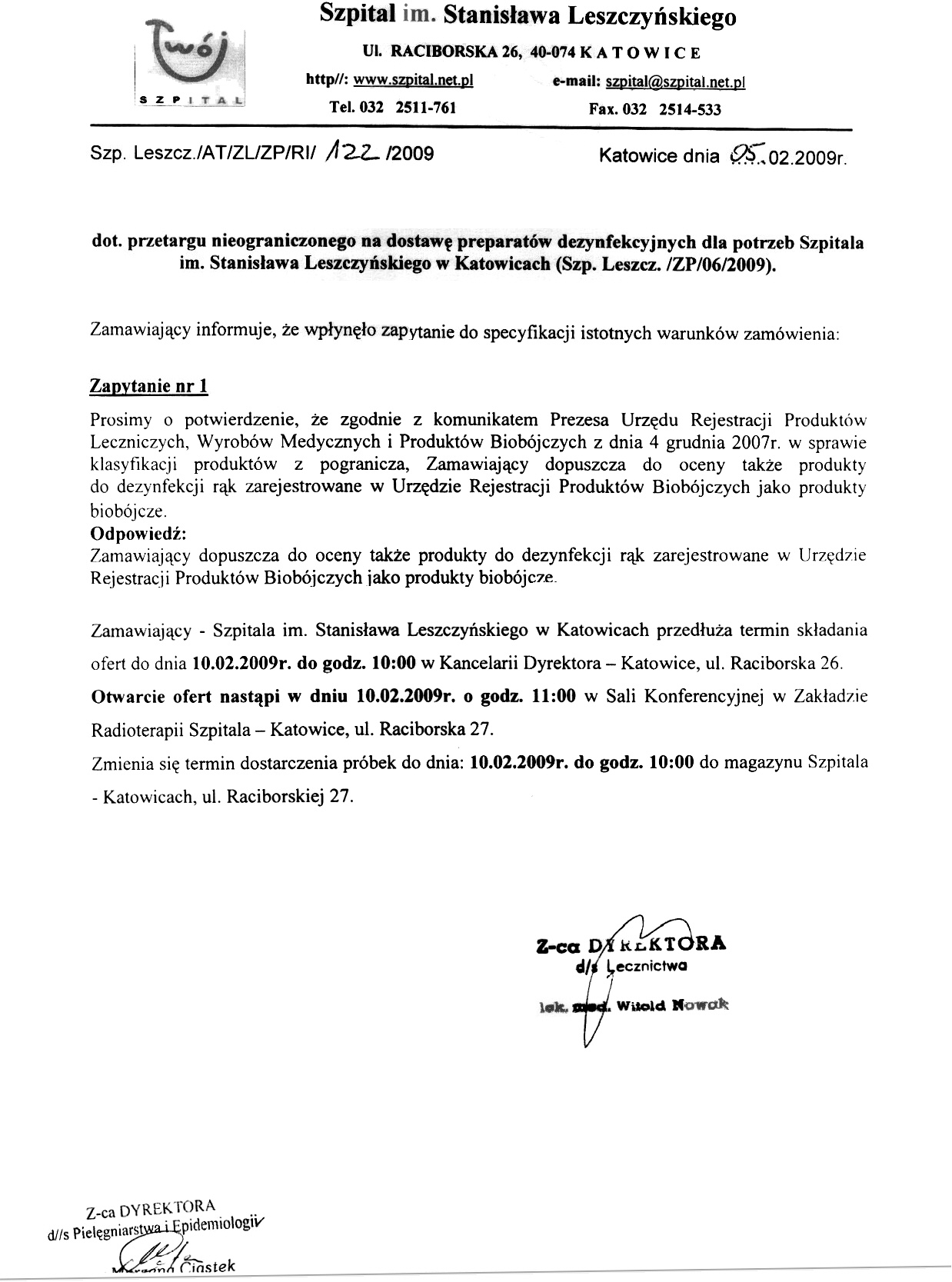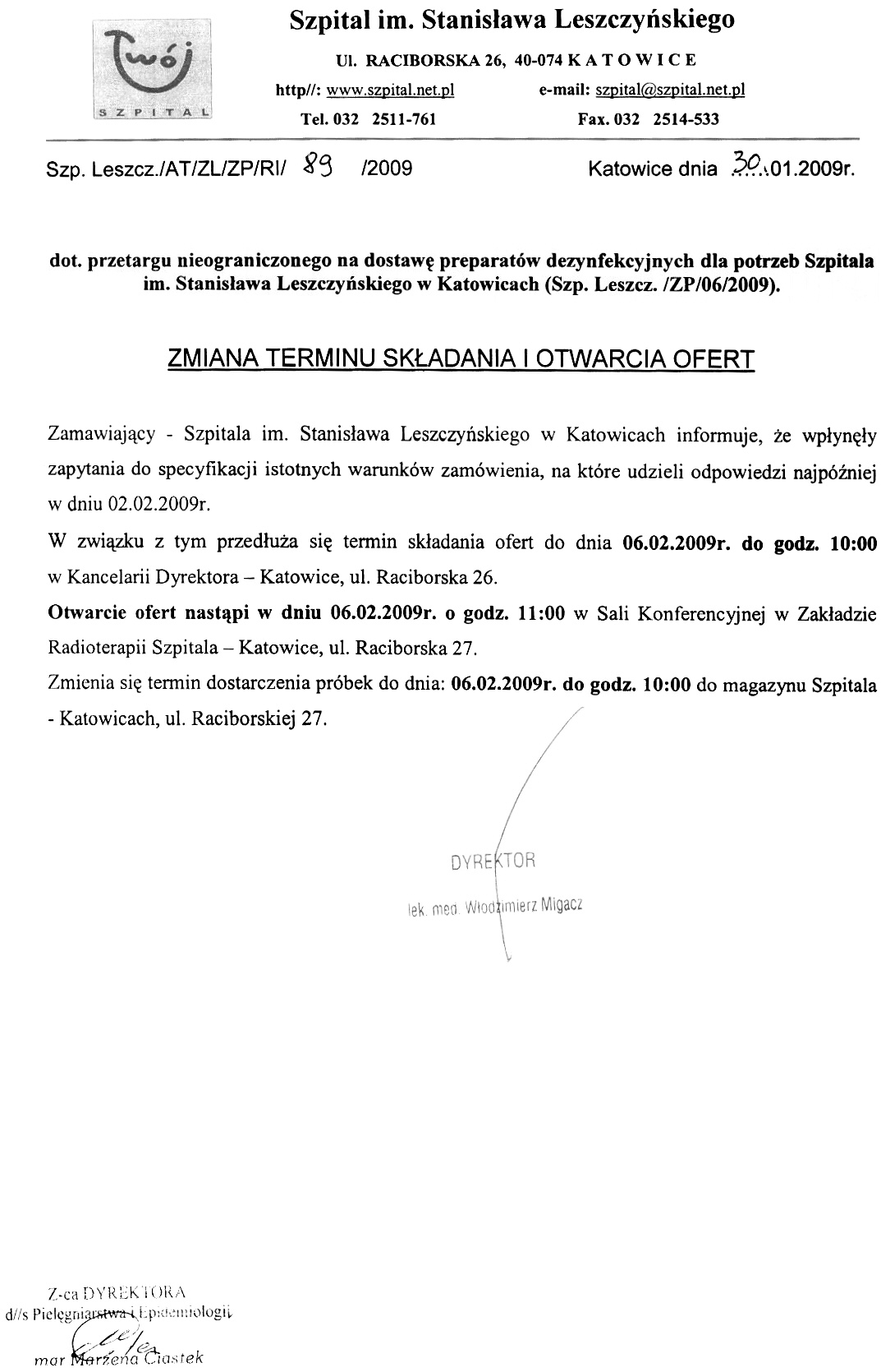 do dnia 03.02.2009r. do godz. 10.00 w Kancelarii Dyrektora Szpitala im. Stanisława Leszczyńskiego w Katowicach, przy ul. Raciborskiej 26.