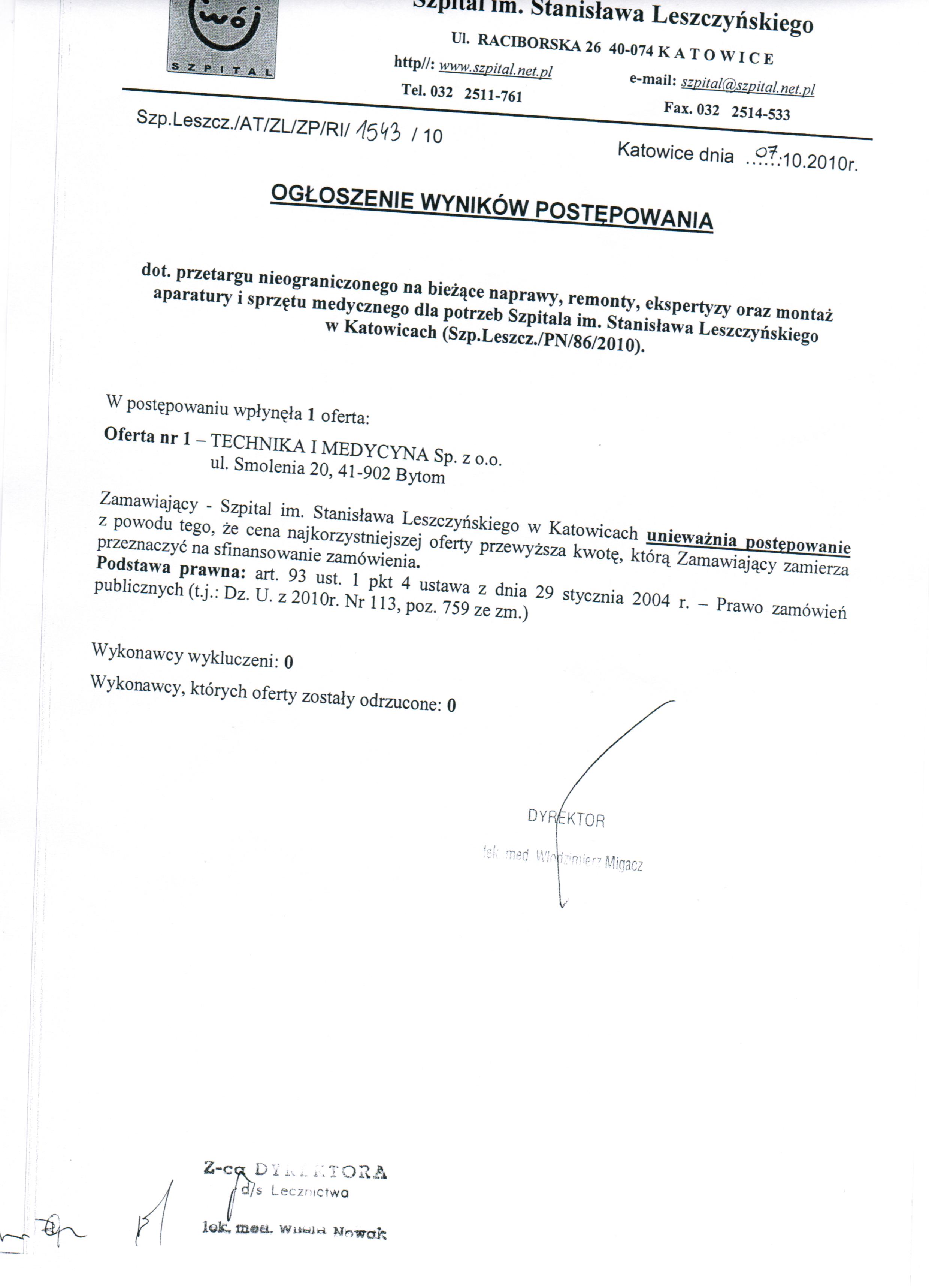w dniu 06.10.2010r. o godz. 11:00 w Szpitalu im. Stanisława Leszczyńskiego w Katowicach ul. Raciborska 28, budynek Przychodni, II piętro, Sekcja Zamówień Publicznych.