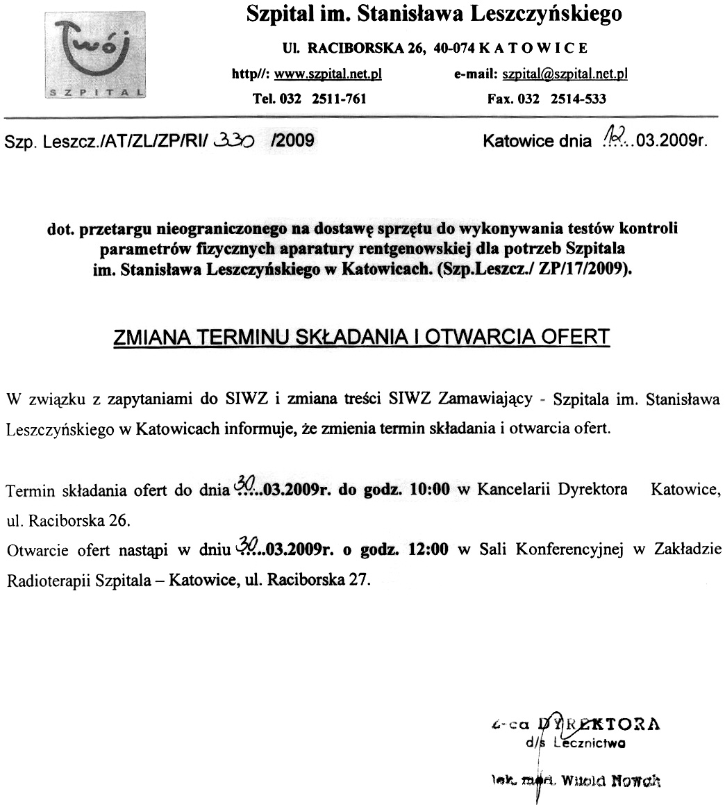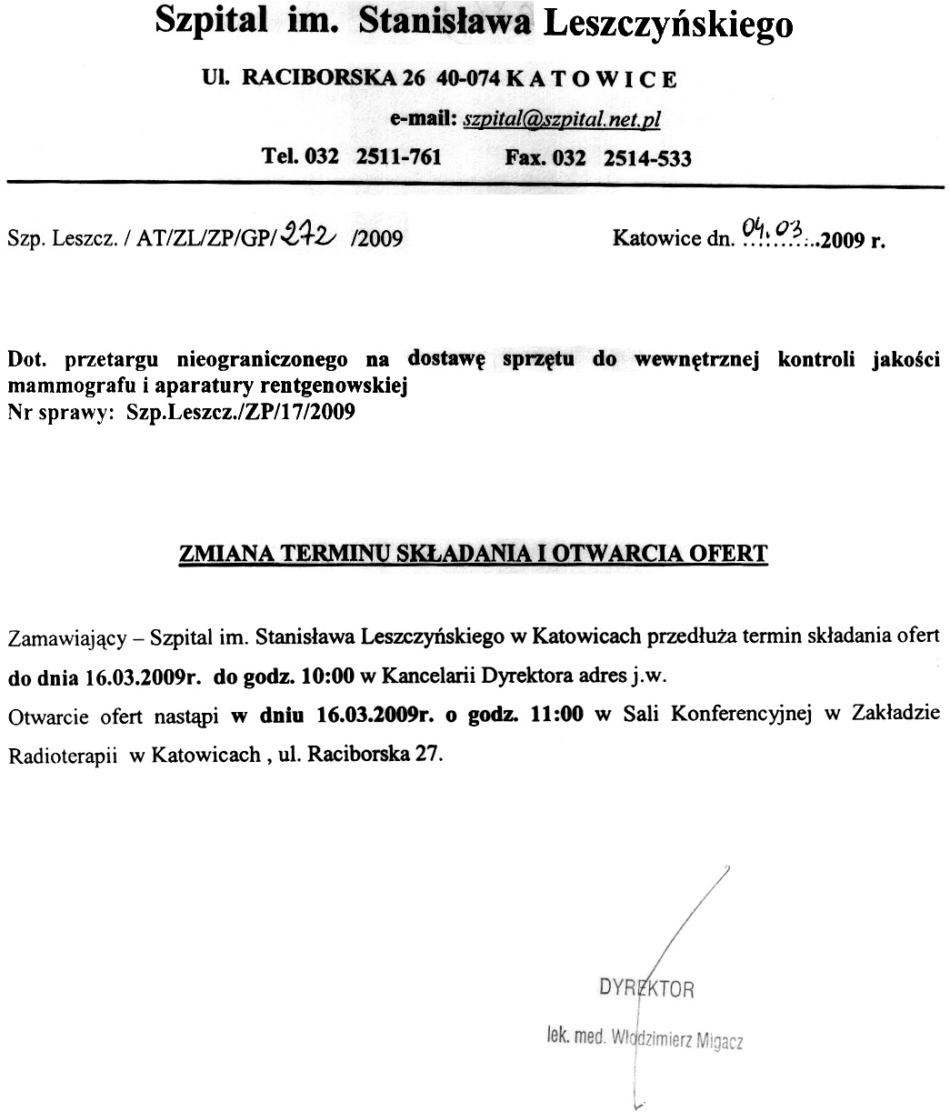 09.03. 2009r. do godz. 10:00 w Kancelarii Dyrektora Szpitala w Katowicach przy ul. Raciborskiej 26.