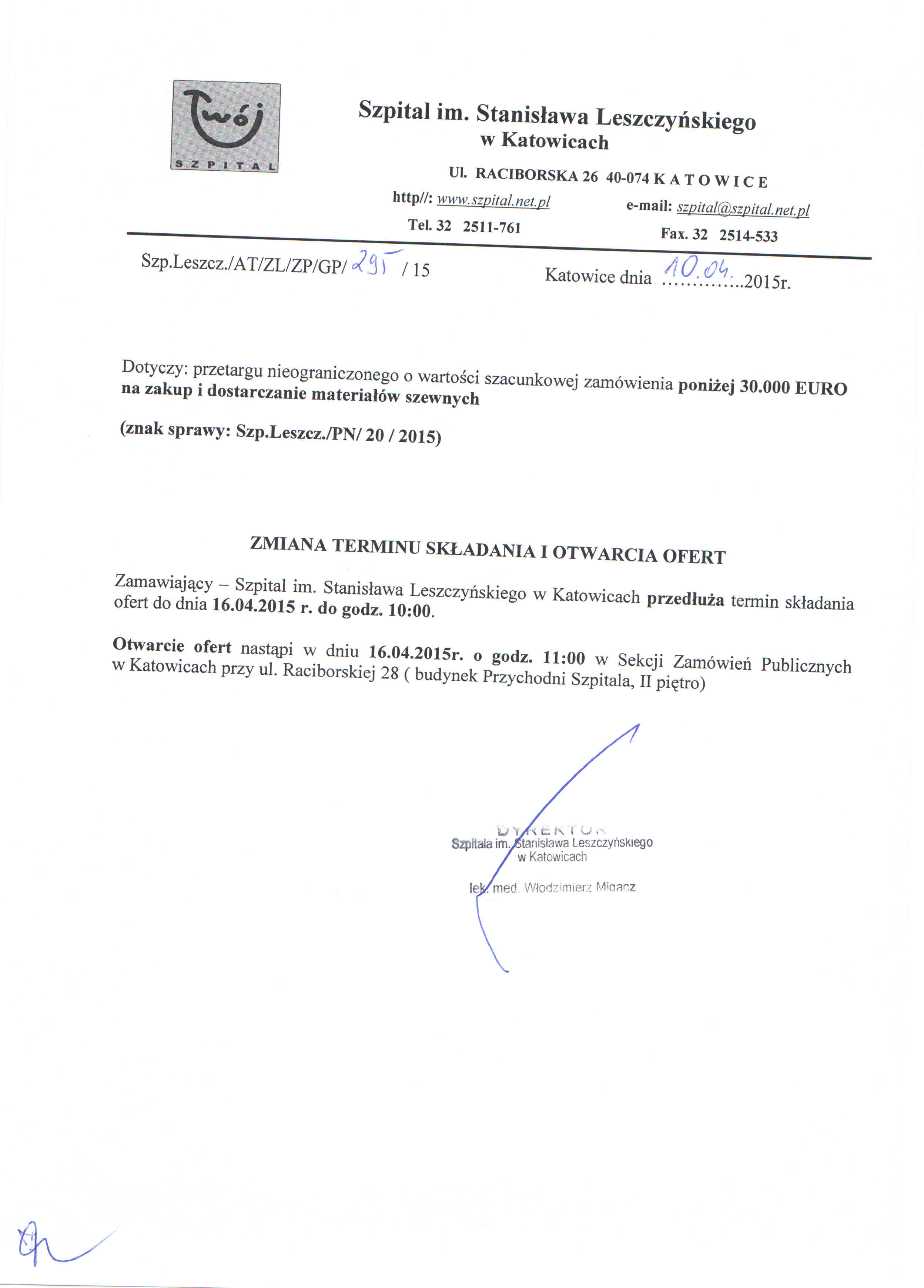 do dnia 14.04.2015r. do godz. 10:00 w Kancelarii Dyrektora Szpitala w Katowicach przy ul. Raciborskiej 26 (I piętro).