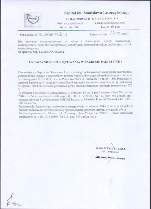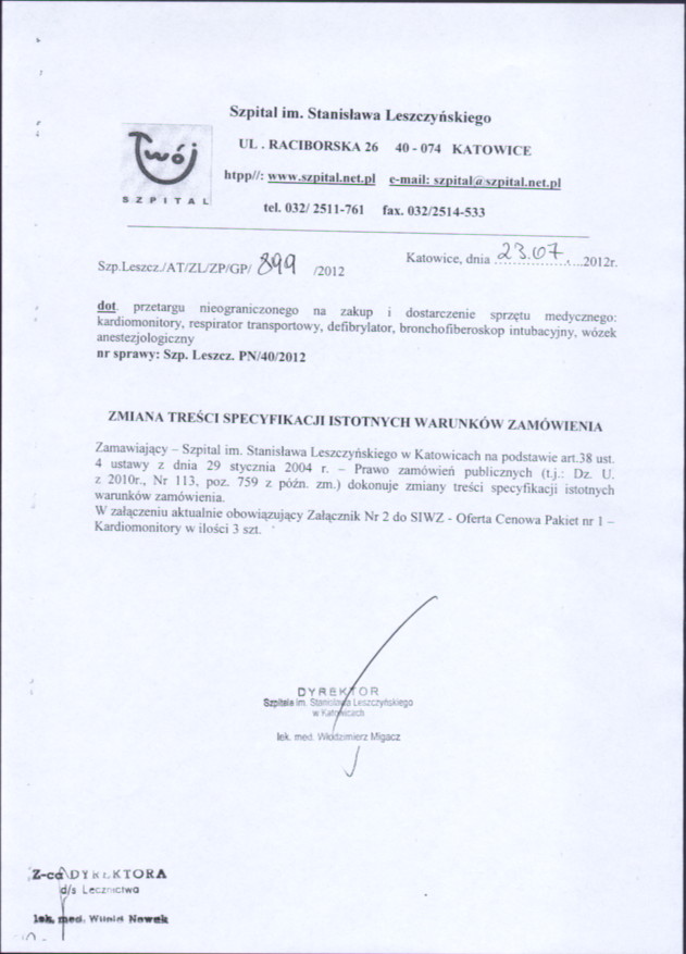 dot. zakupu i dostarczenia sprzętu medycznego: kardiomonitory, respirator transportowy, defibrylator, bronchofiberoskop inkubacyjny, wózek anestezjologiczny: