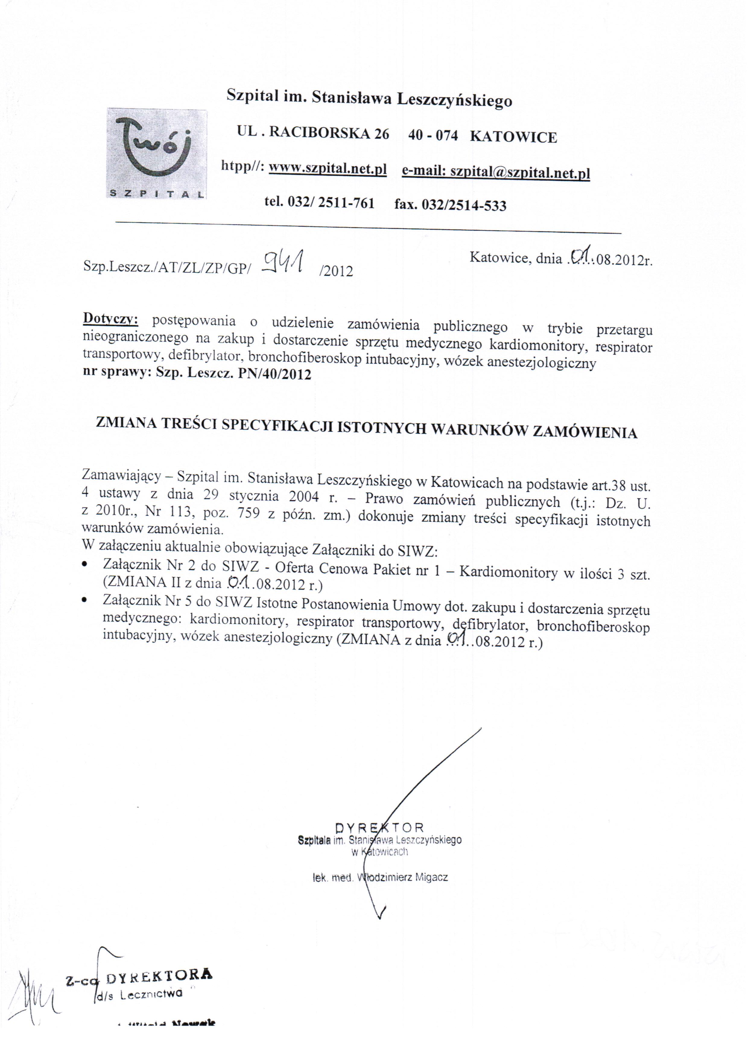 ogłasza przetarg nieograniczony o wartości szacunkowej zamówienia powyżej 14.000 EURO na zakup i dostarczenie sprzętu medycznego: kardiomonitory, respirator transportowy, defibrylator, bronchofiberoskop intubacyjny, wózek anestezjologiczny