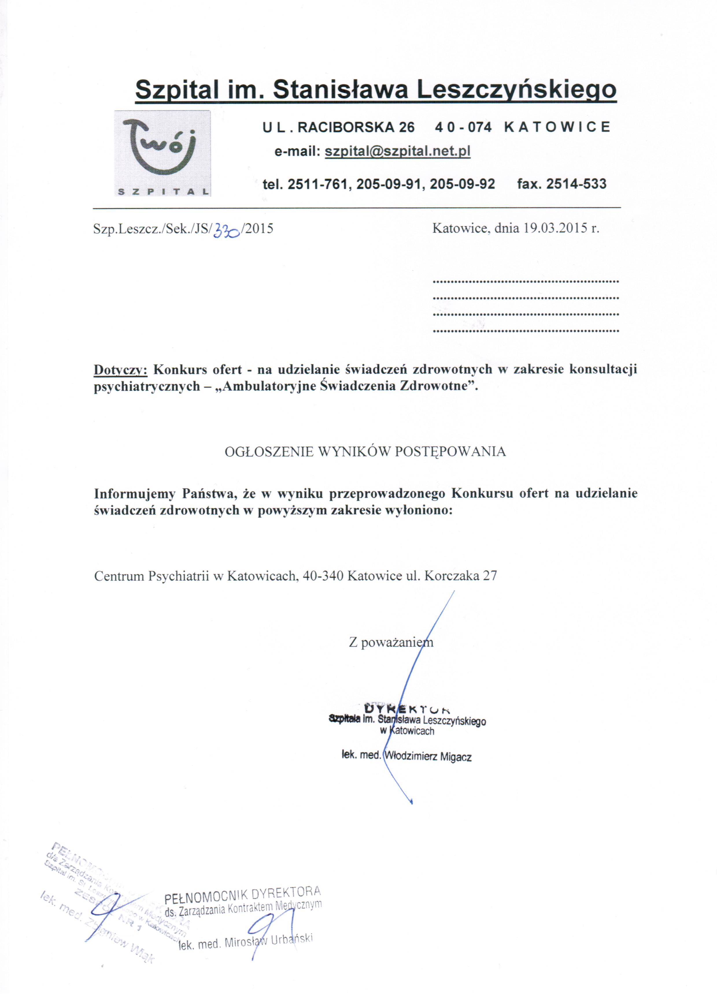Szpital im. Stanisława Leszczyńskiego w Katowicach ul. Raciborska 26 zwany dalej Udzielającym Zamówienia ogłasza zamówienie na udzielanie świadczeń zdrowotnych w zakresie konsultacji psychiatrycznych - "Ambulatoryjne Świadczenia Zdrowotne".