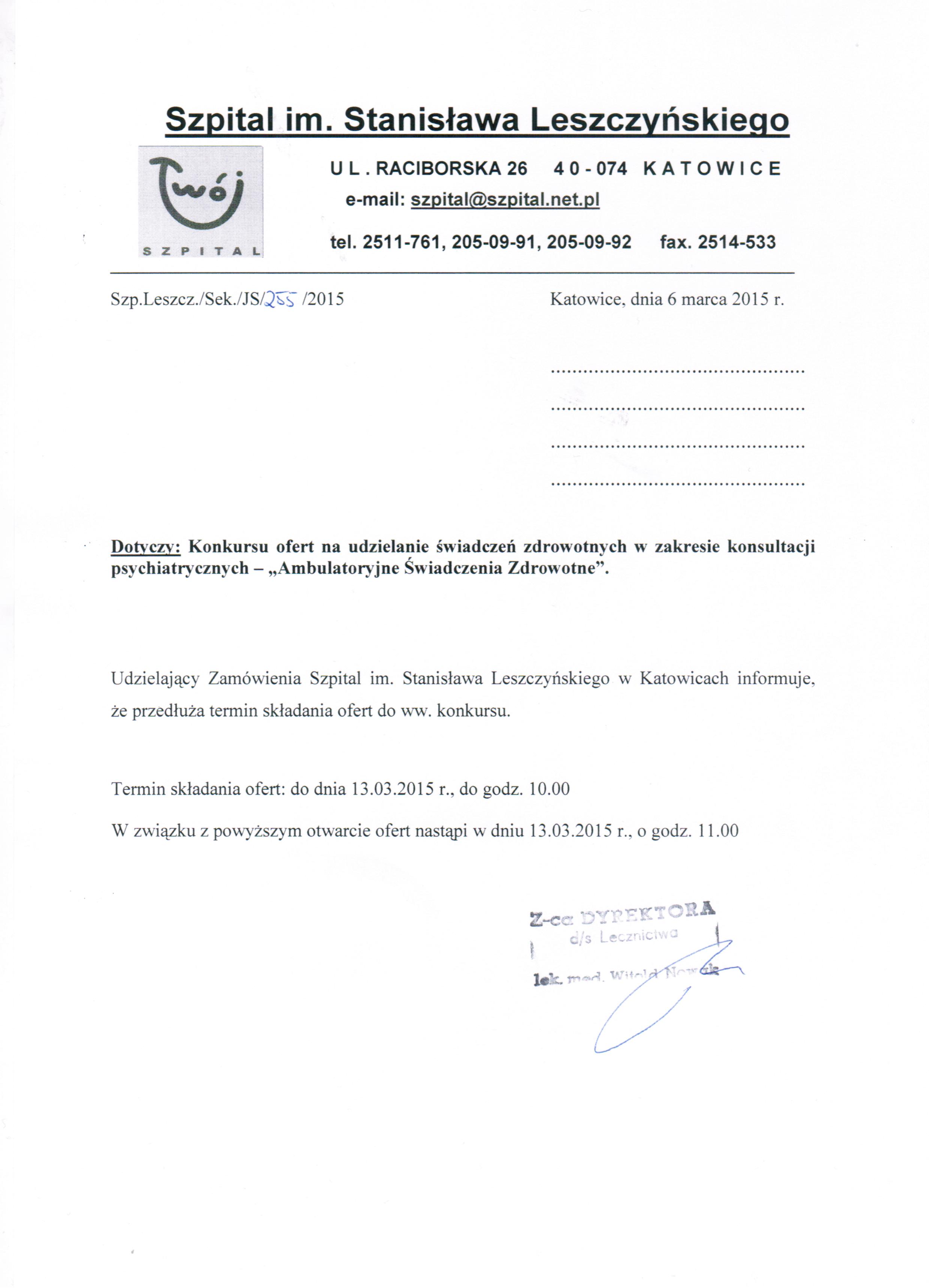 - Otwarcie ofert nastąpi w budynku Dyrekcji Szpitala im. Stanisława Leszczyńskiego, Raciborska 26, I piętro, Sala Konferencyjna w dniu 06.03.2015 r. o godz. 11:00.