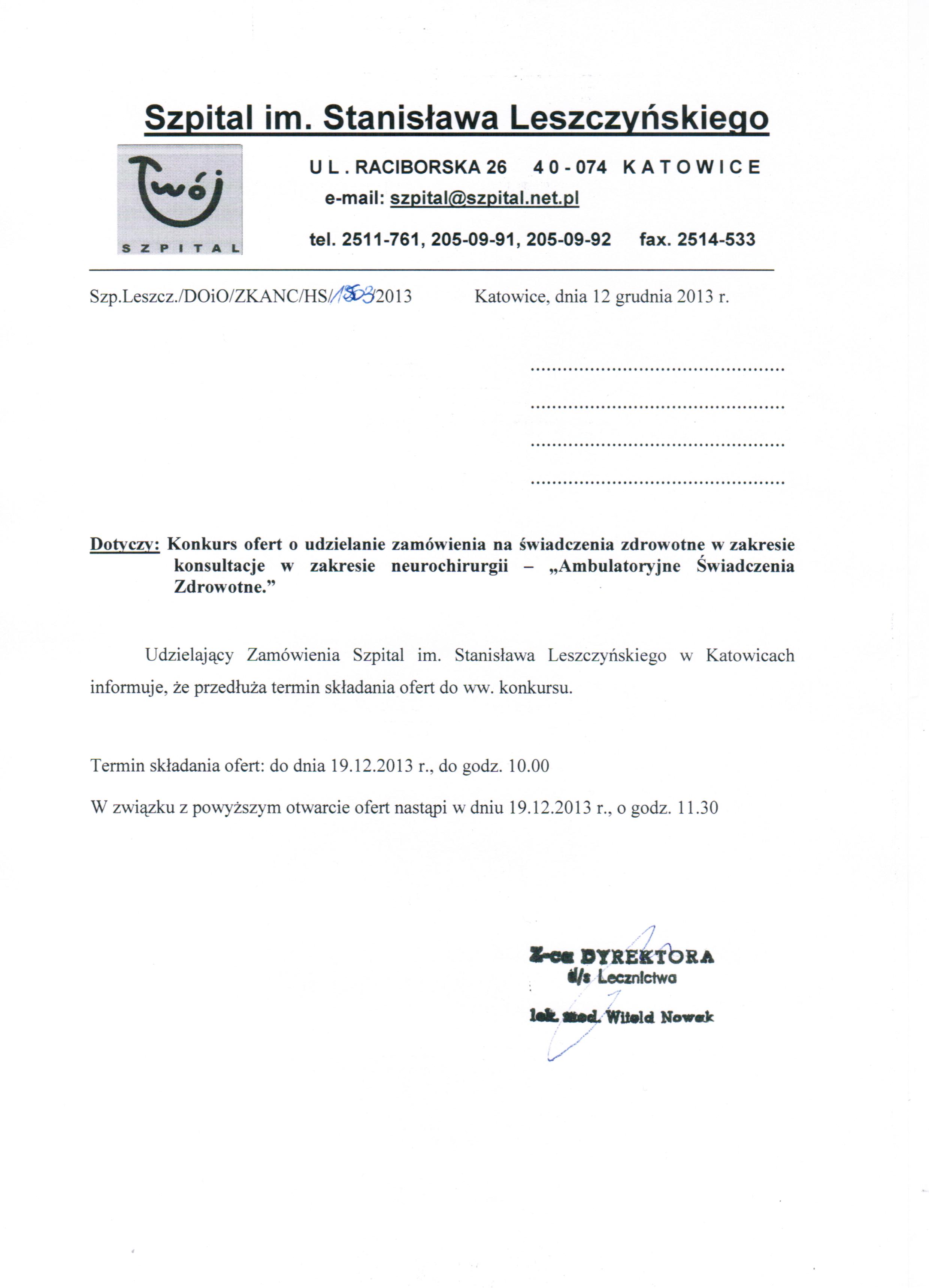 - Otwarcie ofert nastąpi w budynku Dyrekcji Szpitala im. Stanisława Leszczyńskiego, Raciborska 26, I piętro, Sala Konferencyjna w dniu 12.12.2013 o godz. 11.00.