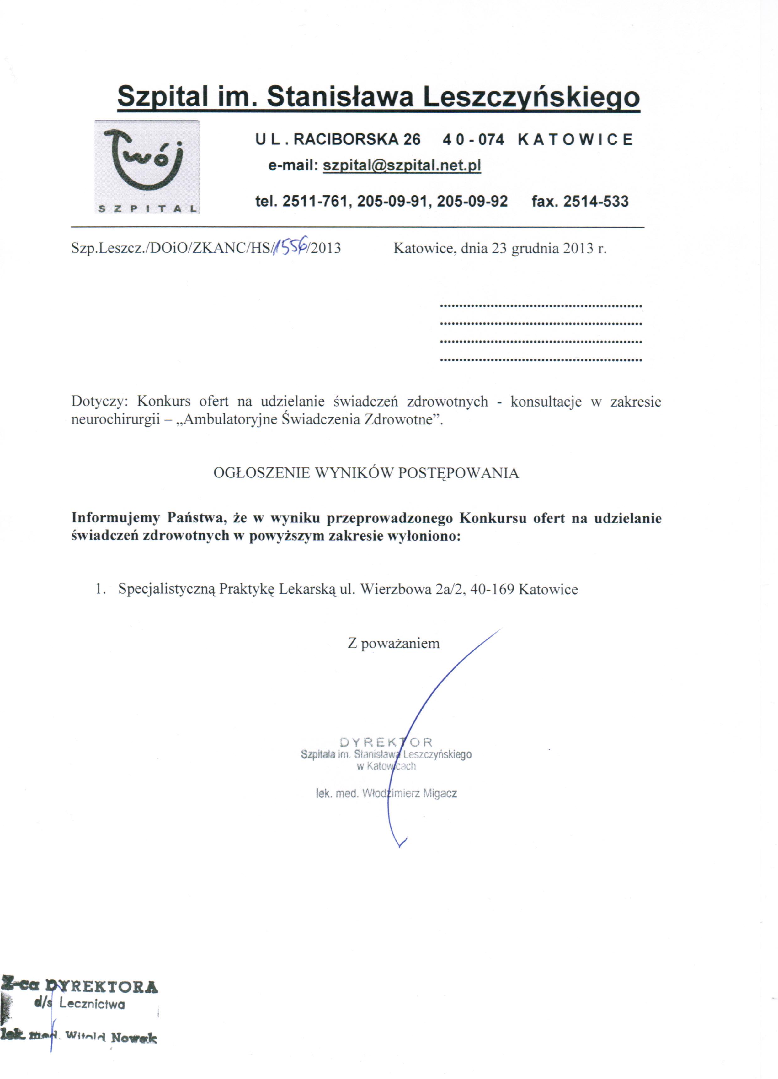 Dodatkowych informacji udziela Z-ca Dyrektora ds. Lecznictwa lek. med. Witold Nowak pod nr tel. (32) 251 17 61.