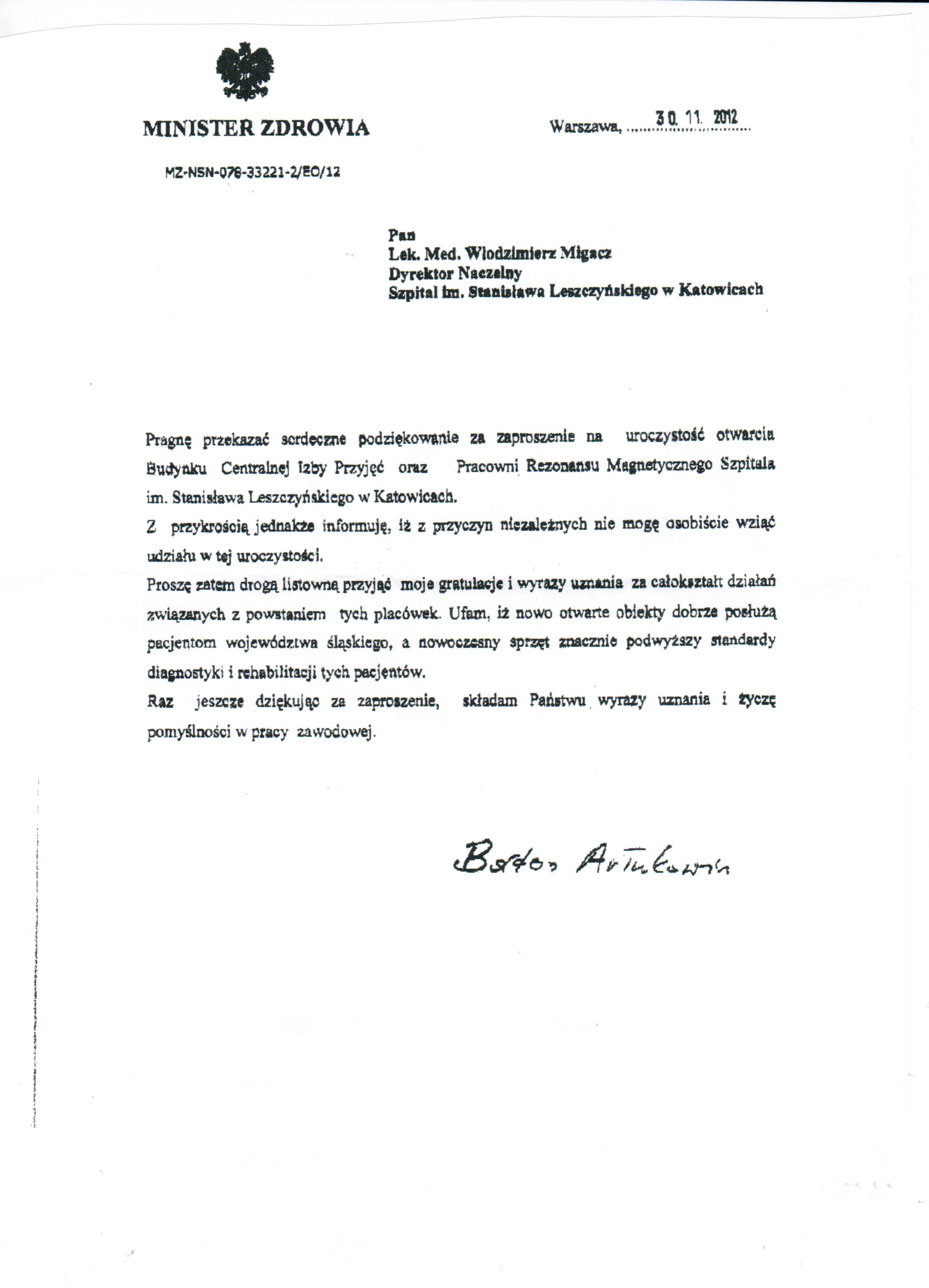 W dniu 30 listopada 2012 r. o godzinie 11.00, w Szpitalu im. Stanisława Leszczyńskiego w Katowicach, przy ul. Raciborskiej 27, odbyła się uroczystość otwarcia