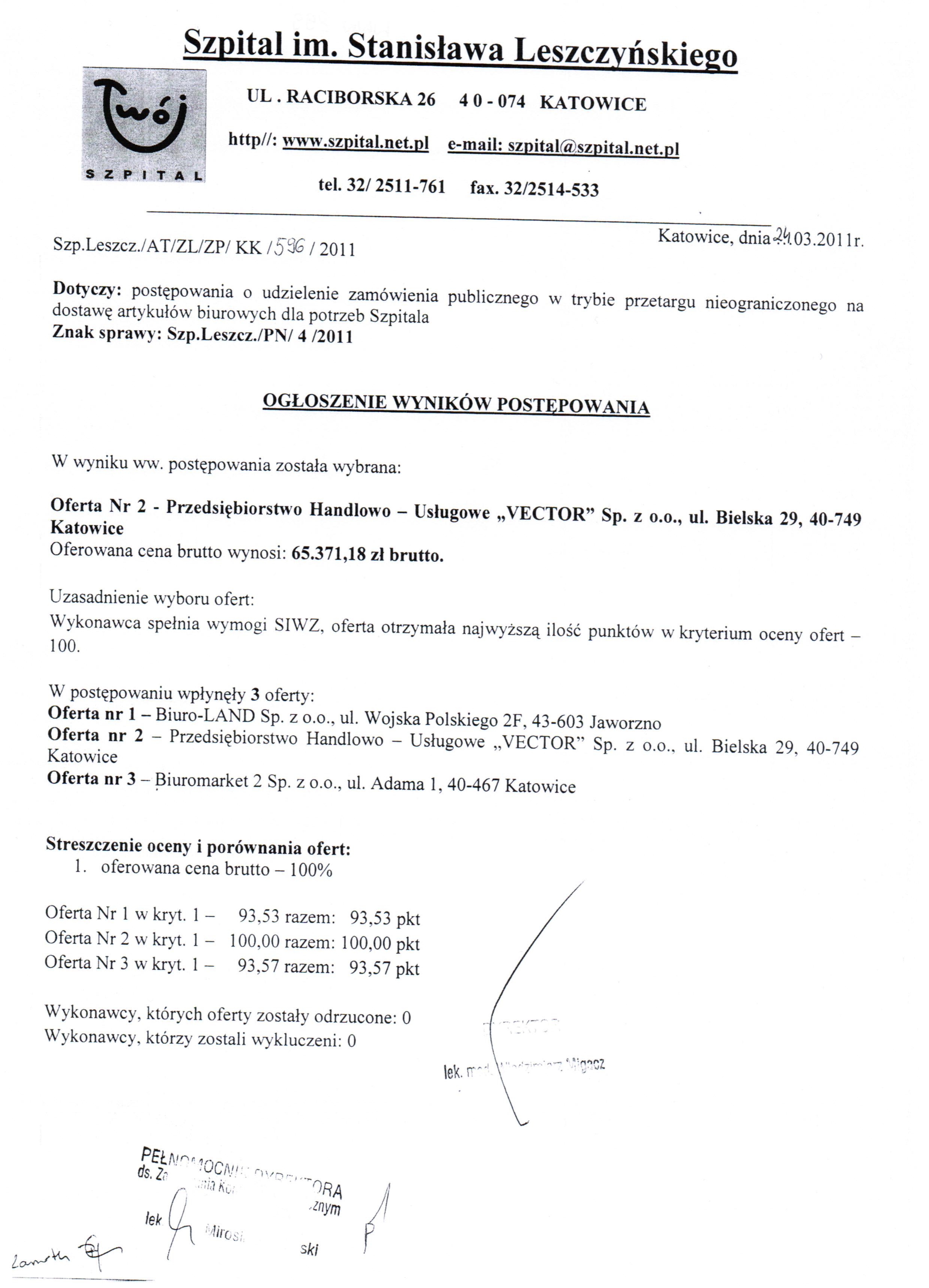 Otwarcie ofert nastąpi w dniu 31.01.2011r. o godz. 11:00 w Budynku Poradni Szpitalnej w Katowicach przy ul. Raciborskiej 28 (II piętro).